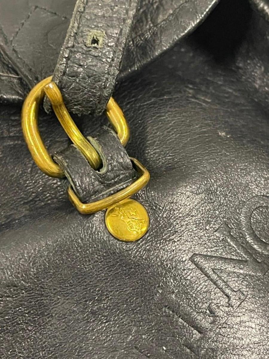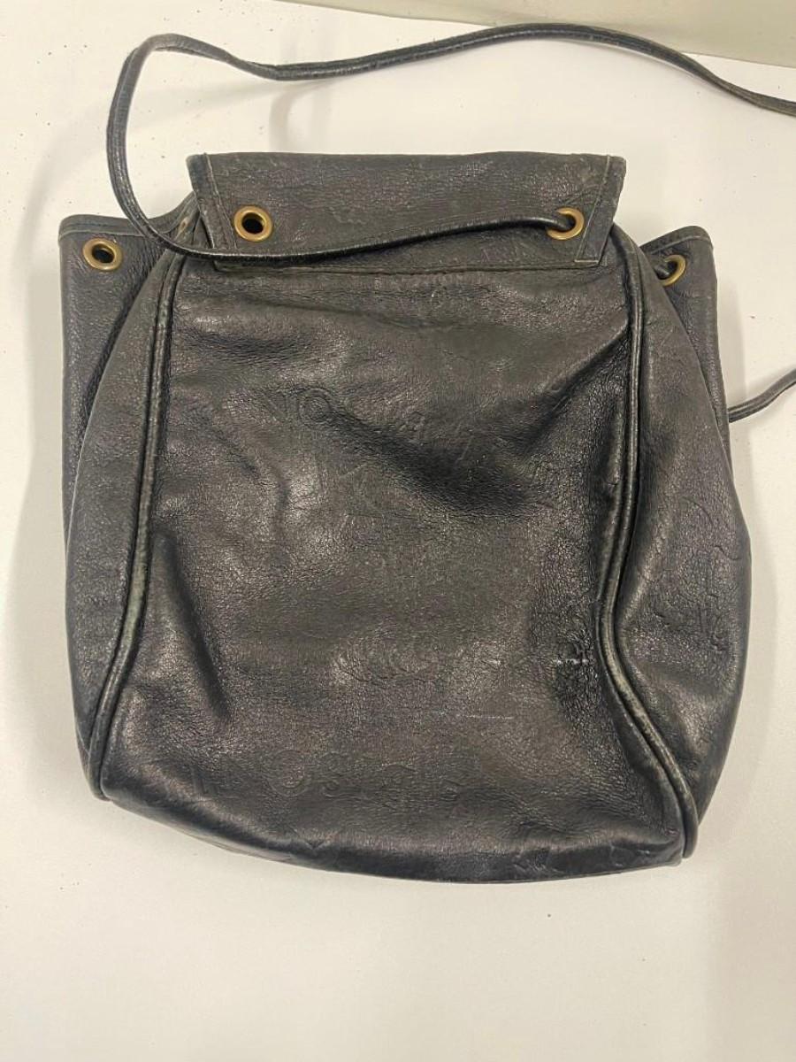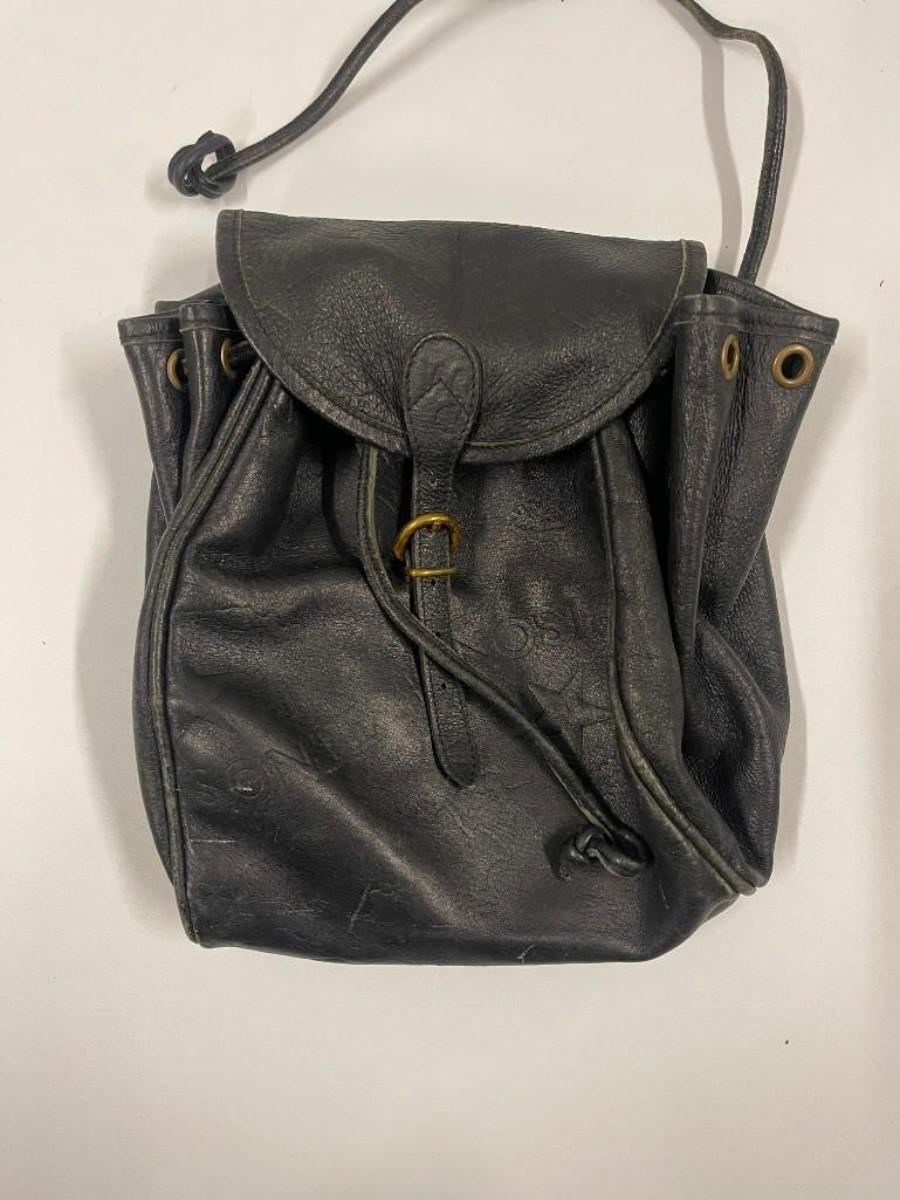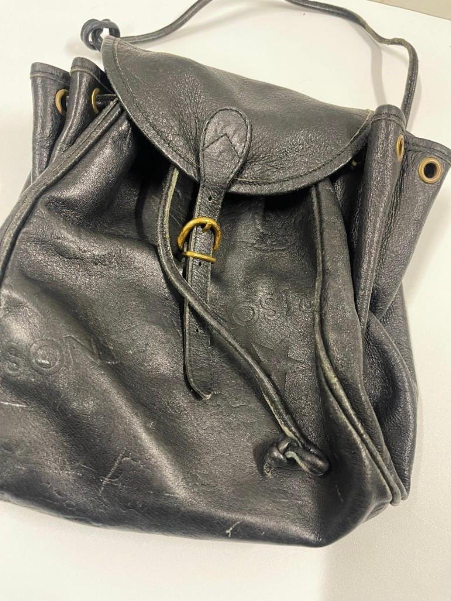 Vintage Il Bisonte black leather drawstring handbag. Shows significant wear. 8" x 9"