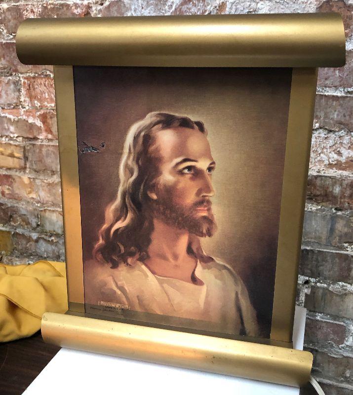 Here is a backlit metal frame featuring a portrait print of Jesus Christ...Vintage..Working...Some damage on image(pictured)...12 x 10"...