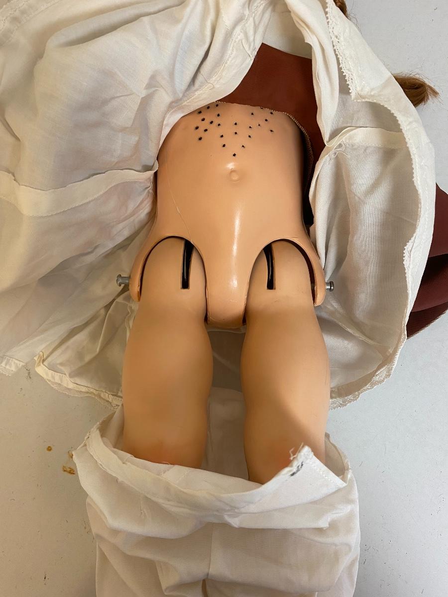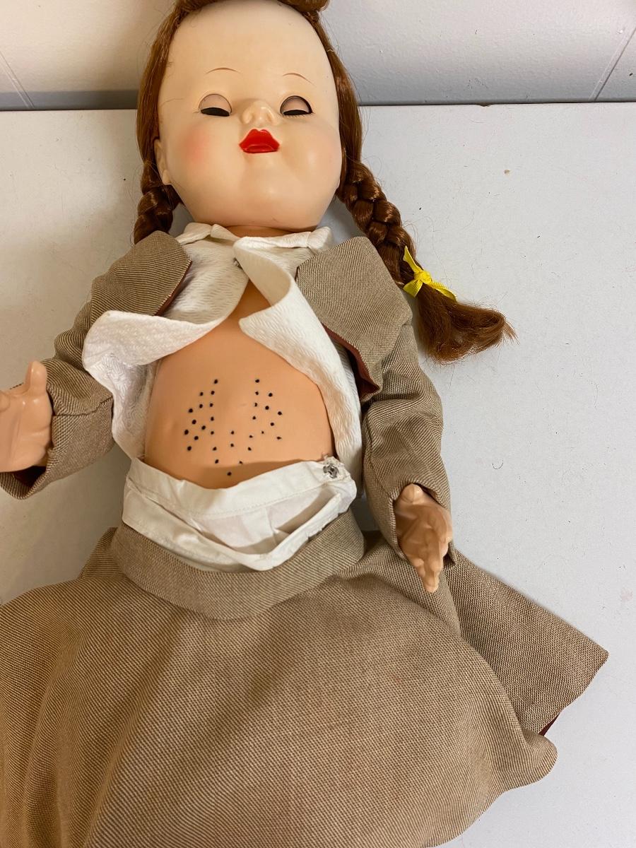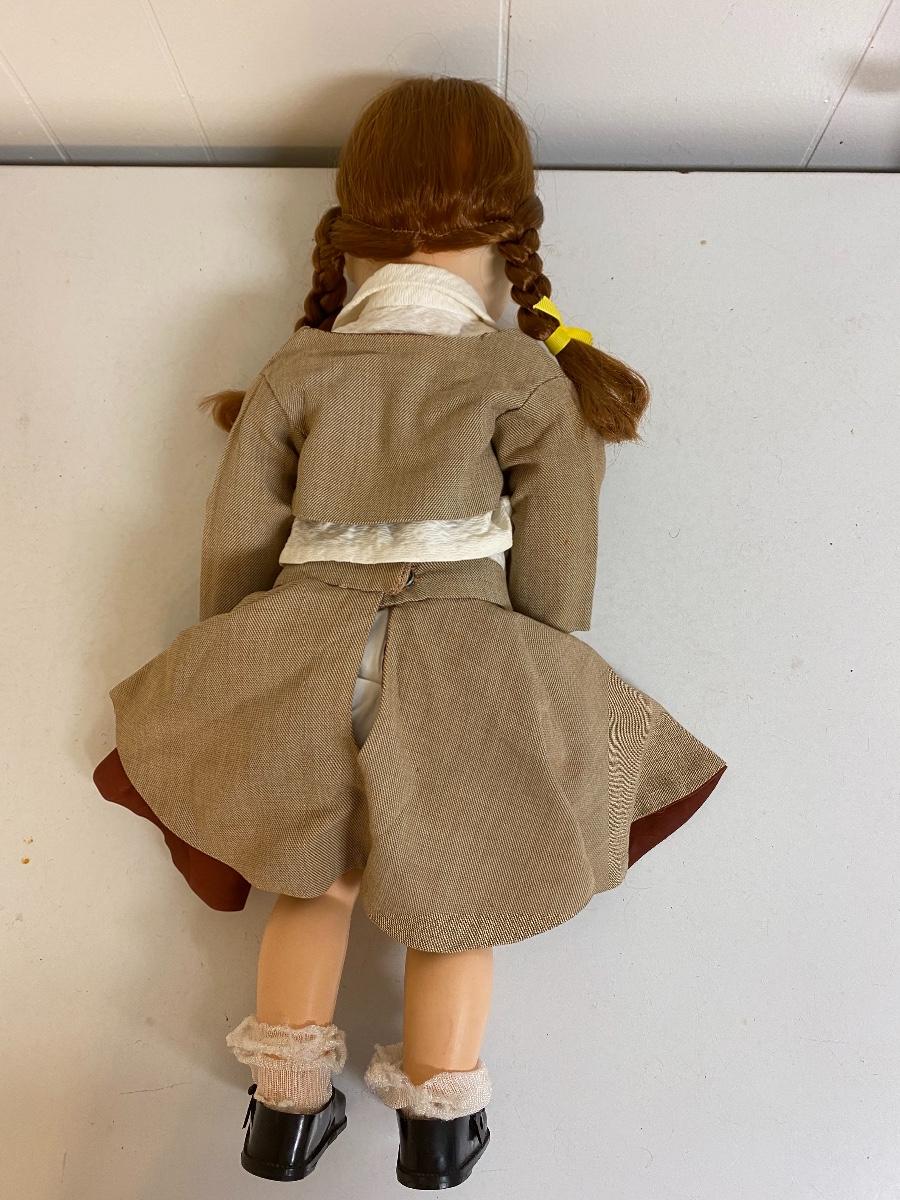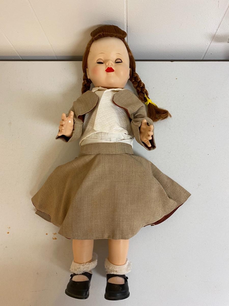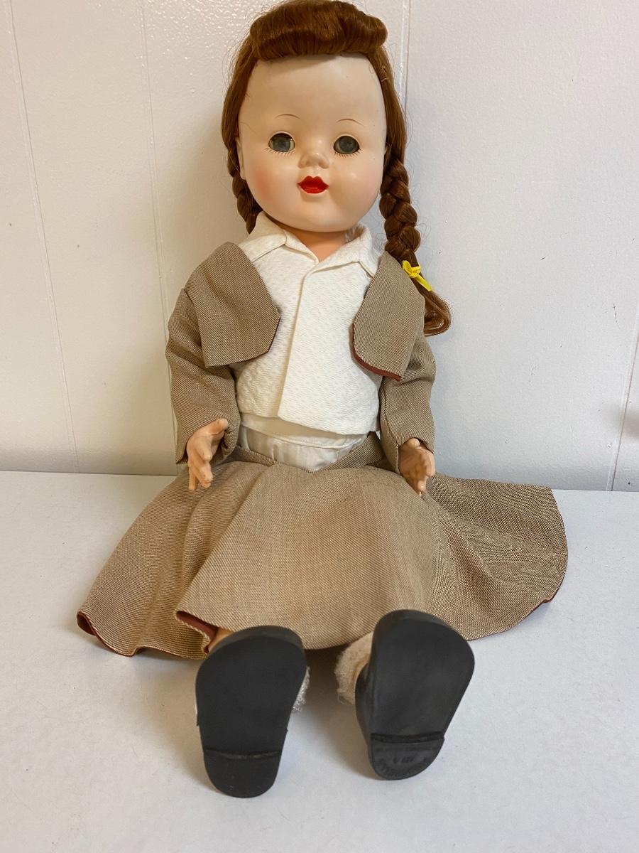 Vintage IMPCO 22 inch Saucy Walker doll. Hard plastic, red hair in braids. Outfit included but I don’t think it’s original - jacket, skirt, blouse, slip, pantaloons, shoes & socks. She does walk