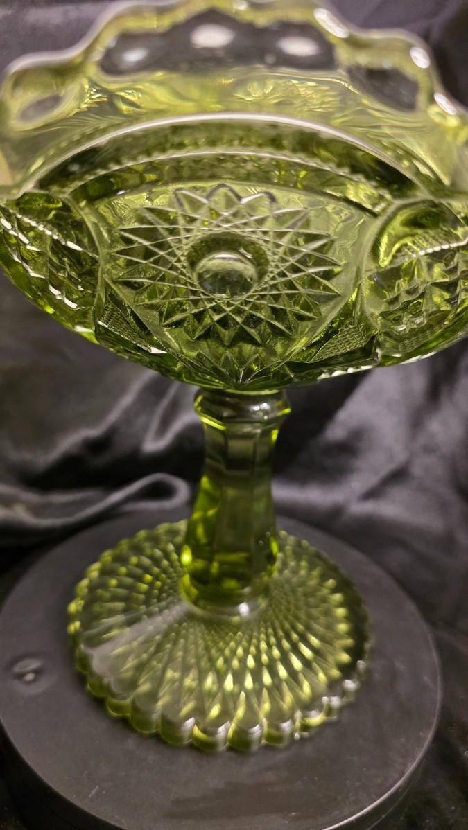 Want to avoid the bidding process? You can stake your claim on this item and swipe it from your fellow Treasure Hunters by completing the purchase on our website at: https://treasuresofbako.com/products/vintage-imperial-glass-avocado-green-hobstar-pedestal-compote-mid-century-statement-bowl?utm_source=copyToPasteBoard&utm_medium=product-links&utm_content=web