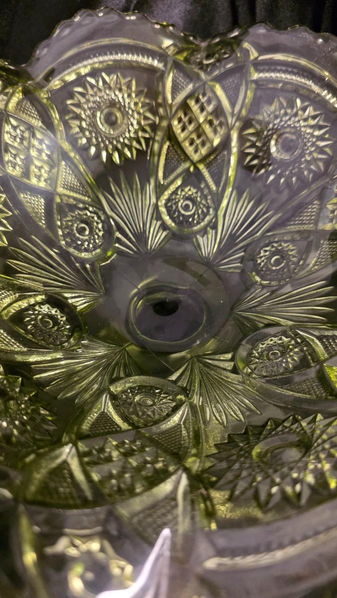 There is a certain glow that only vintage pressed glass can achieve—a depth of color and light that feels alive. This Imperial Glass pedestal compote carries that unmistakable presence, rendered in a rich avocado green that shifts beautifully as light moves across its surface. Every angle reveals layered geometry: radiating starbursts, diamond panels, and delicate scalloped edges that speak to both precision and artistry.