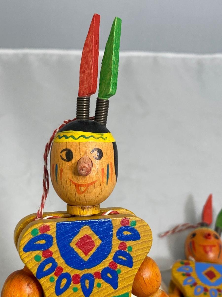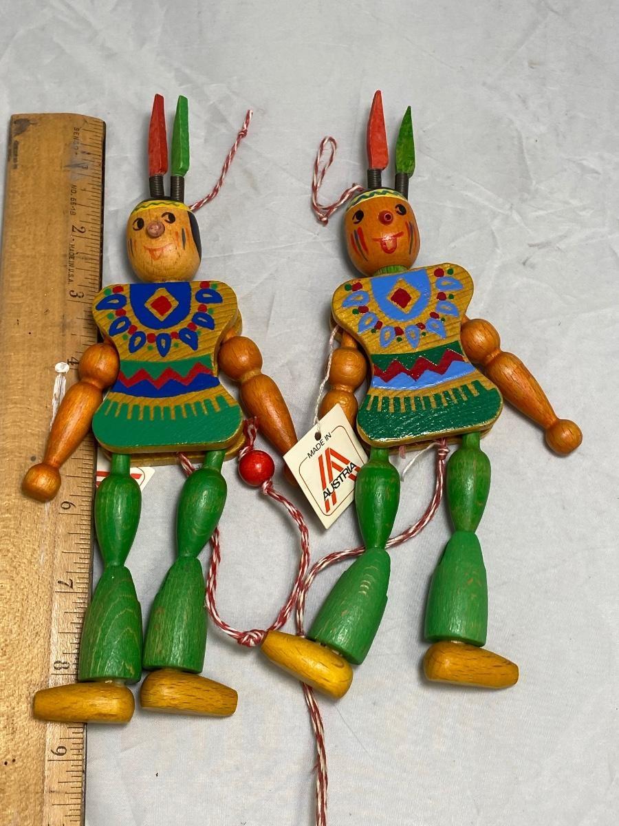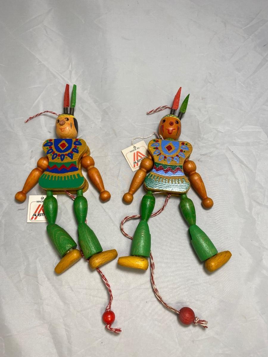 Pair of vintage jumping jack wood pull toys. Made in Austria, have original hang tags still attached. Painted to look like Indians. One is in working condition, the other needs some strings repaired but both look great otherwise. About 9" size.