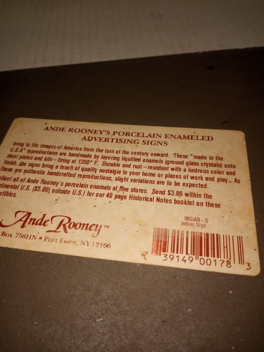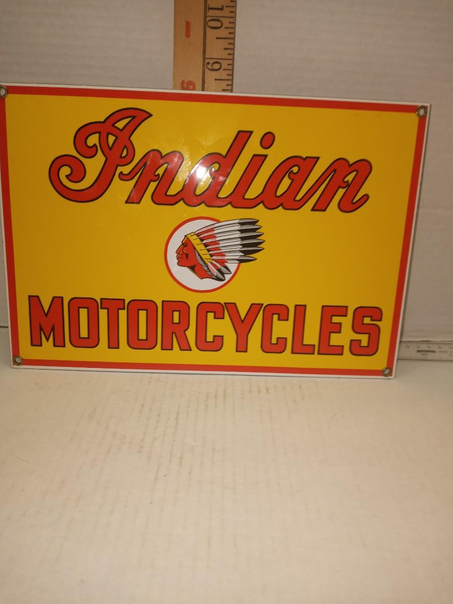 Vintage Indian Motorcycles Ande Rooney Porcelain sign 8.5"x12" Pre-owned