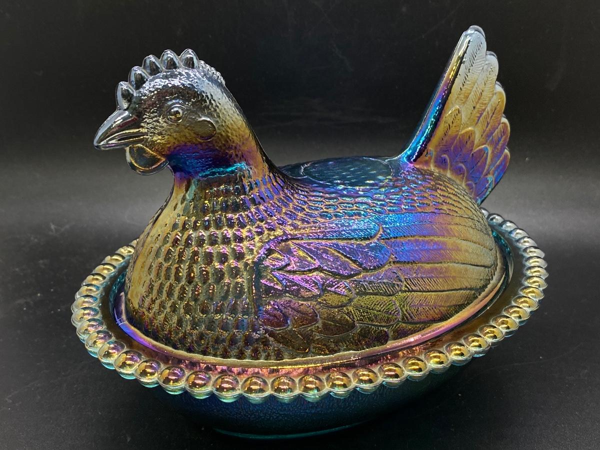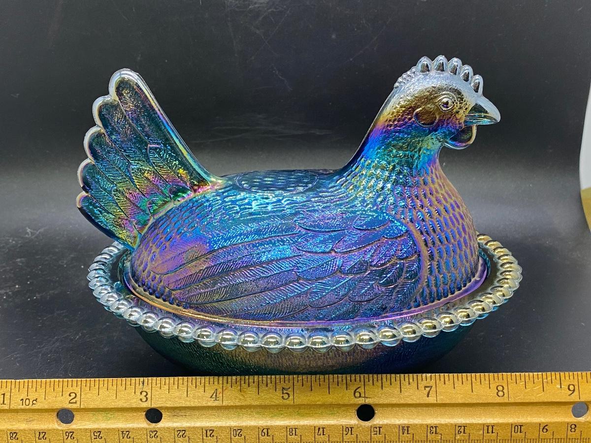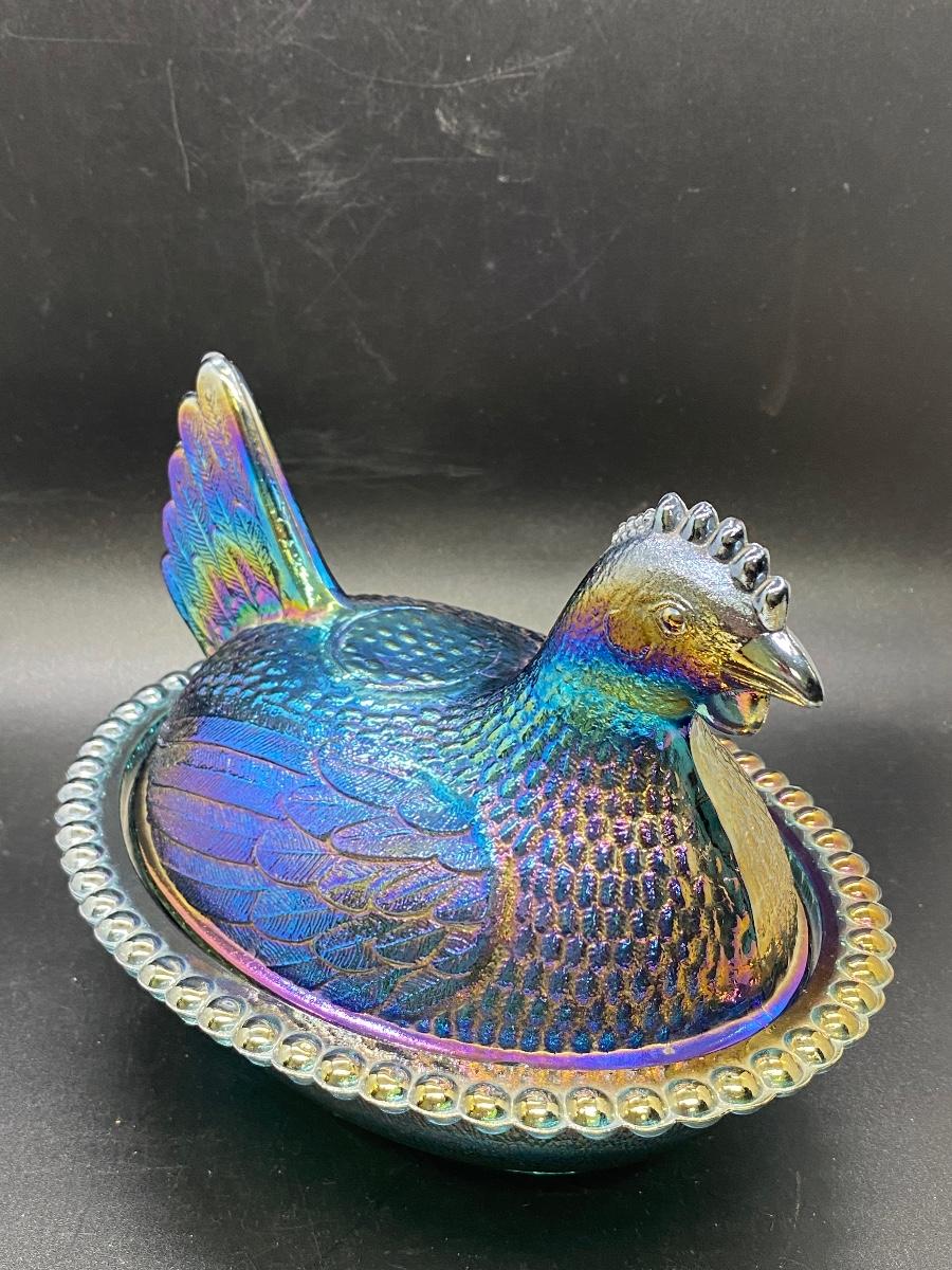 Vintage blue carnival glass hen in a basket butter dish from Indiana Glass. Great rainbow finish. There is a small chip along the edge of chicken lid. Displays great. About 7" size.