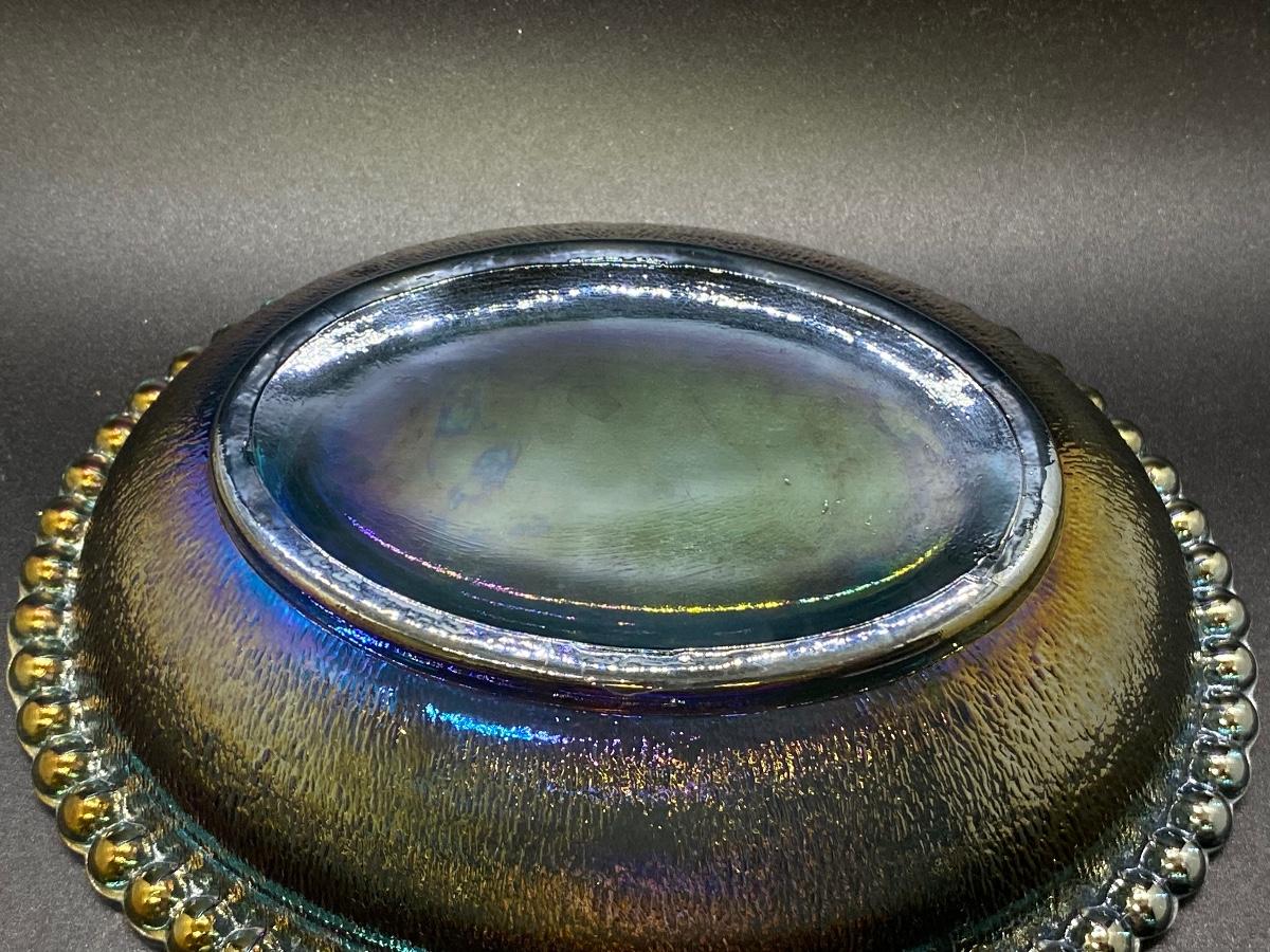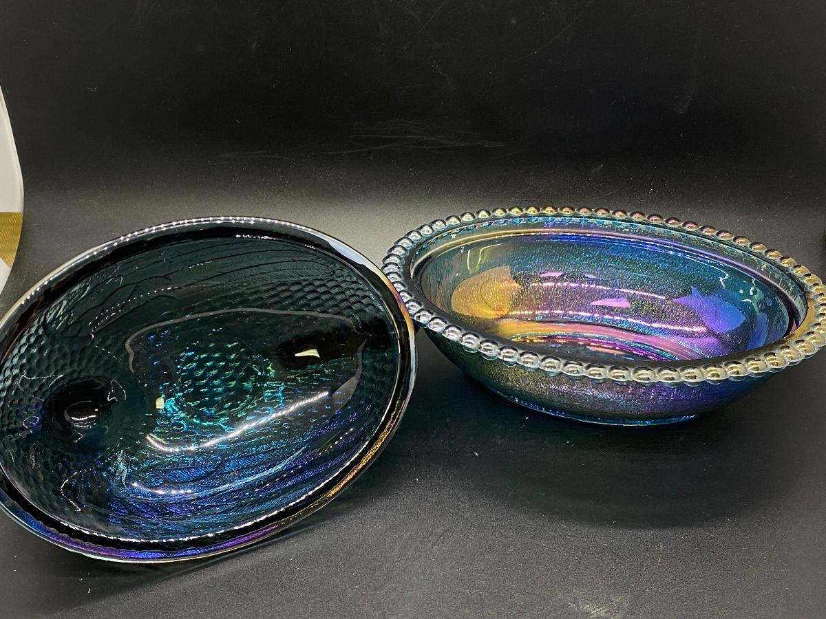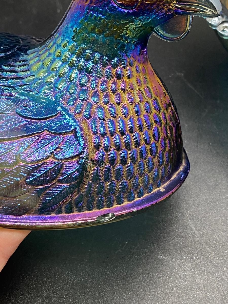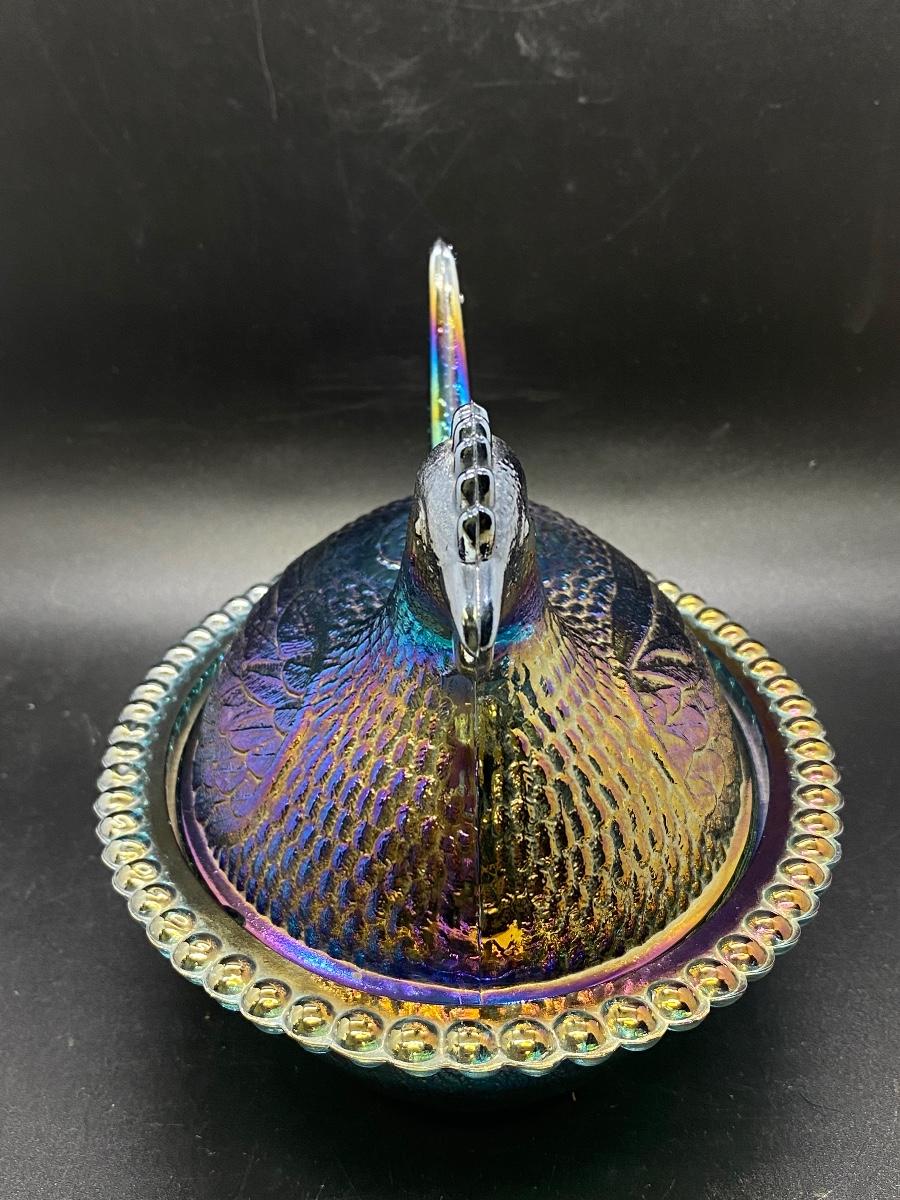 Vintage blue carnival glass hen in a basket butter dish from Indiana Glass. Great rainbow finish. There is a small chip along the edge of chicken lid. Displays great. About 7" size.