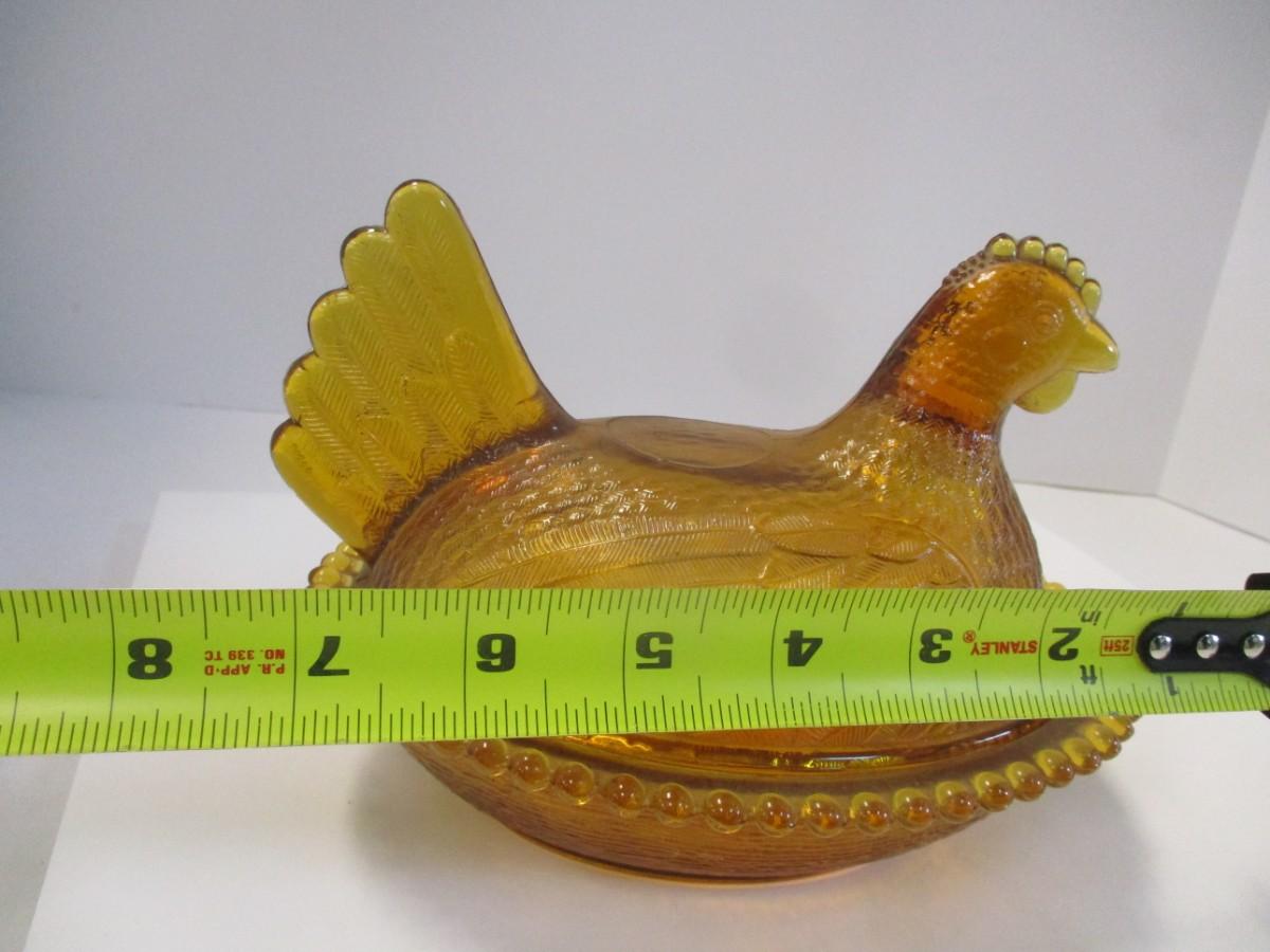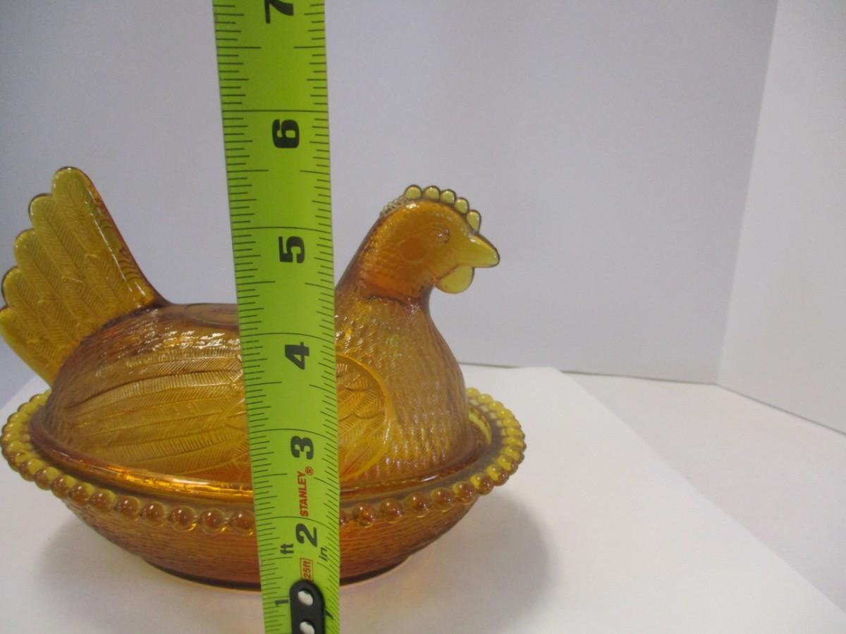 The Vintage Indiana Glass Amber Brown Hen On Nest Covered Candy Dish is a charming and nostalgic piece that adds a touch of elegance to any table setting. Made by Indiana Glass, known for their quality craftsmanship, this candy dish features a beautiful brown color and is made of clear glass. The unique hen on nest design adds a whimsical touch to the classic piece, making it a perfect addition to any vintage-inspired collection.