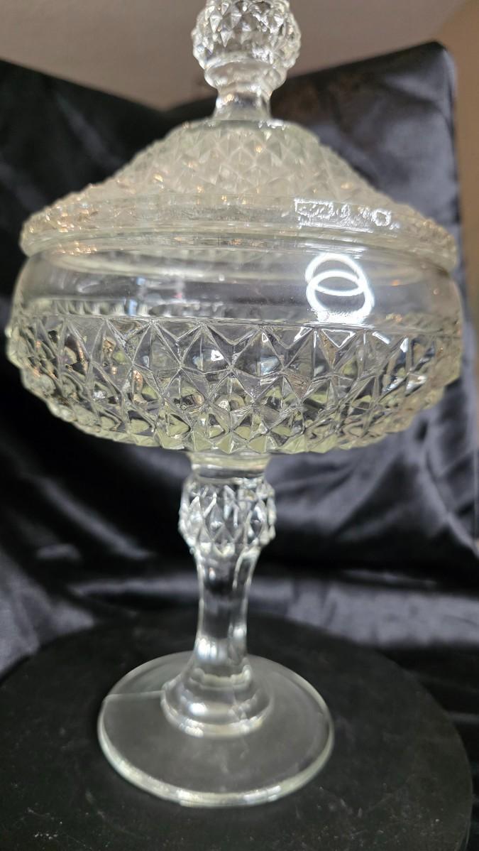 Buy early on our website at: https://treasuresofbako.com/products/vintage-indiana-glass-diamond-point-covered-compote-footed-pedestal-candy-dish-clear-pressed-glass-1960s-mid-century-elegance?utm_source=copyToPasteBoard&utm_medium=product-links&utm_content=web