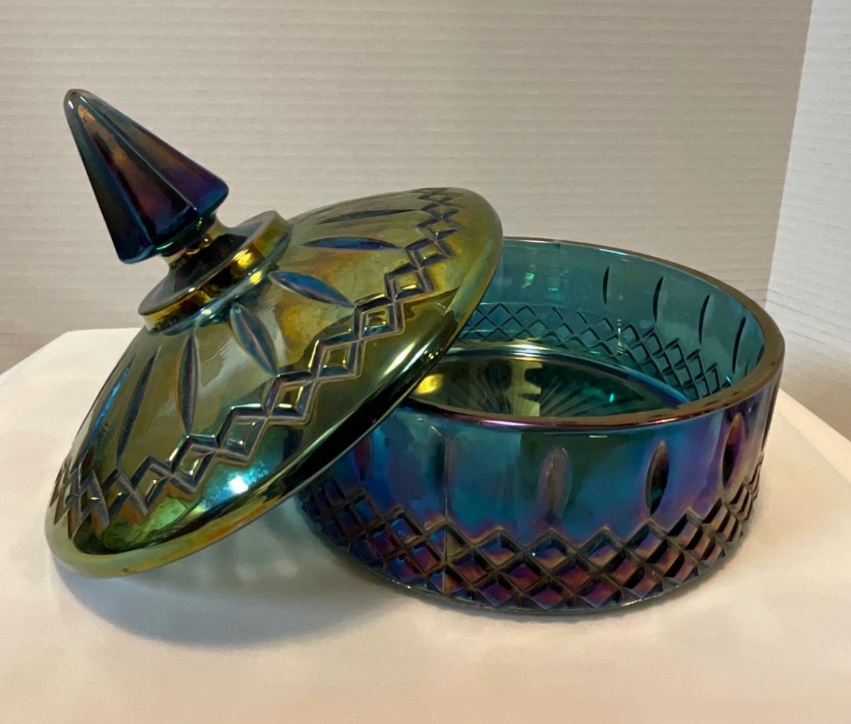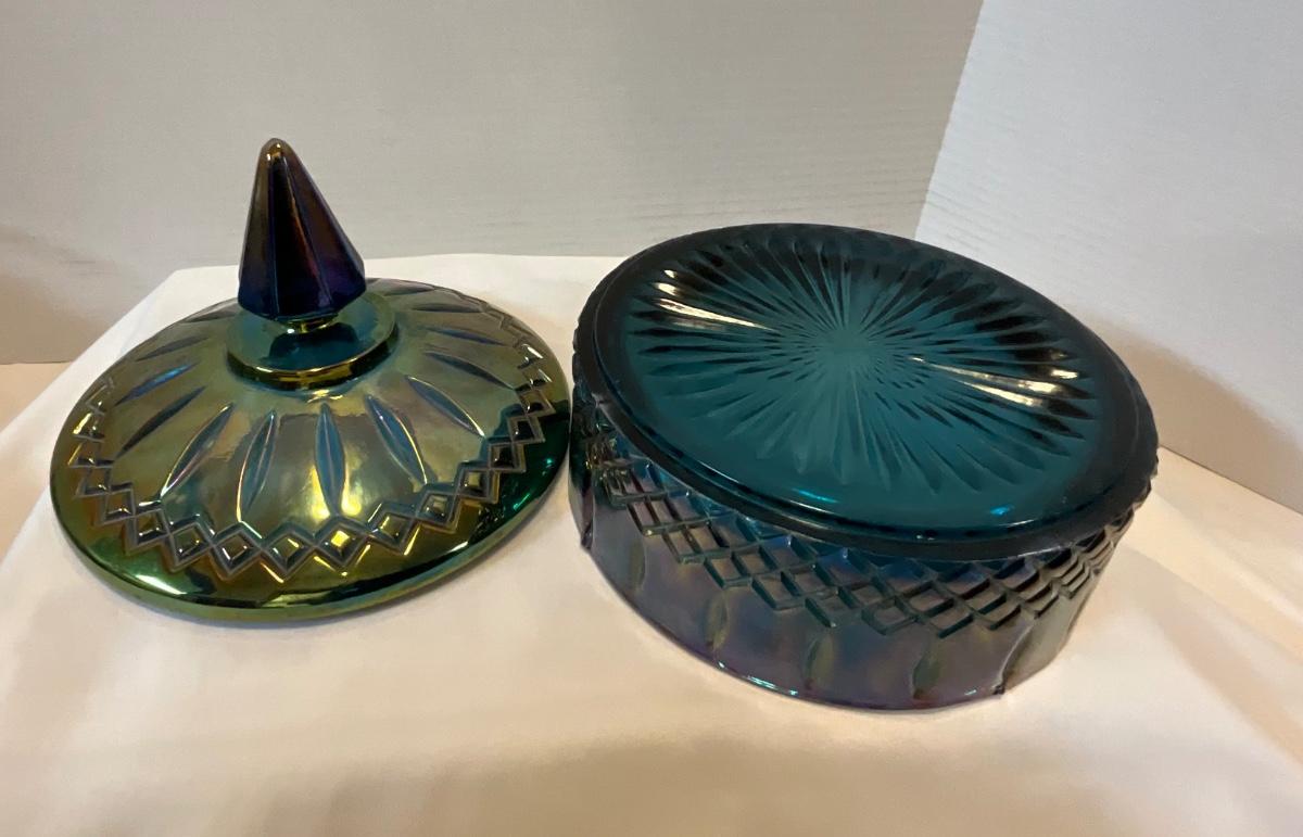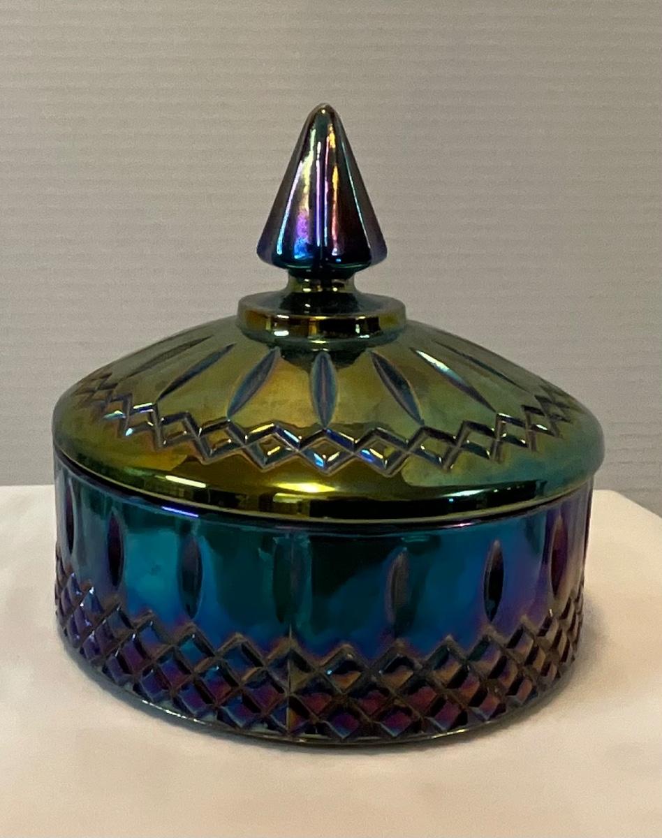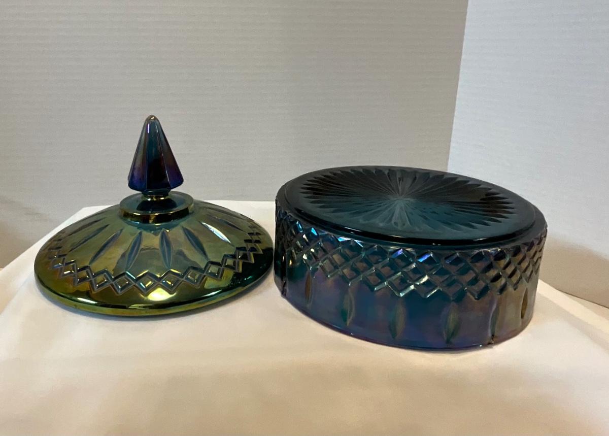 Vintage Indiana Glass Peacock Blue Carnival Candy Dish w/Lid