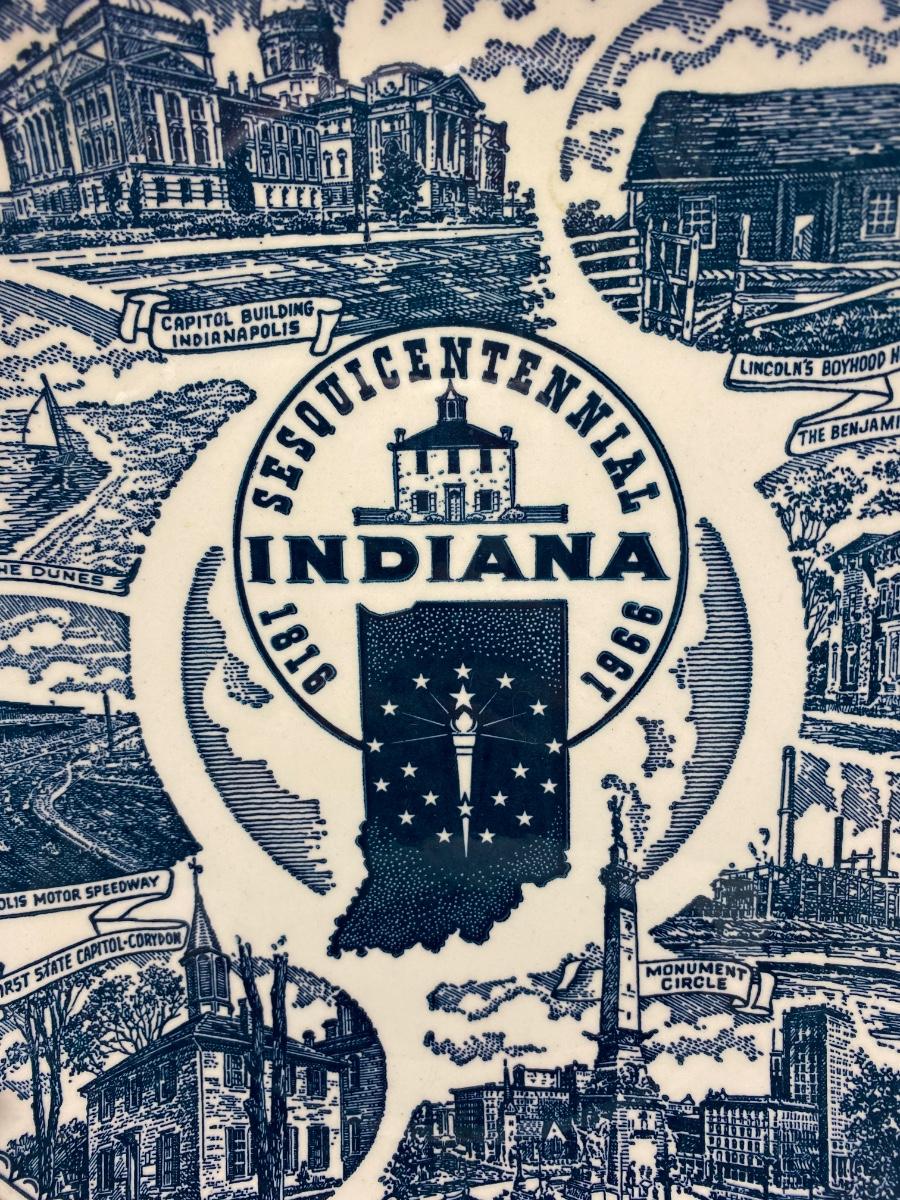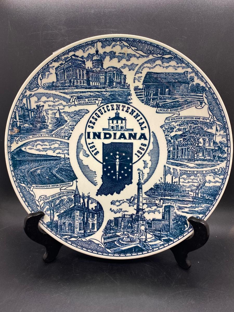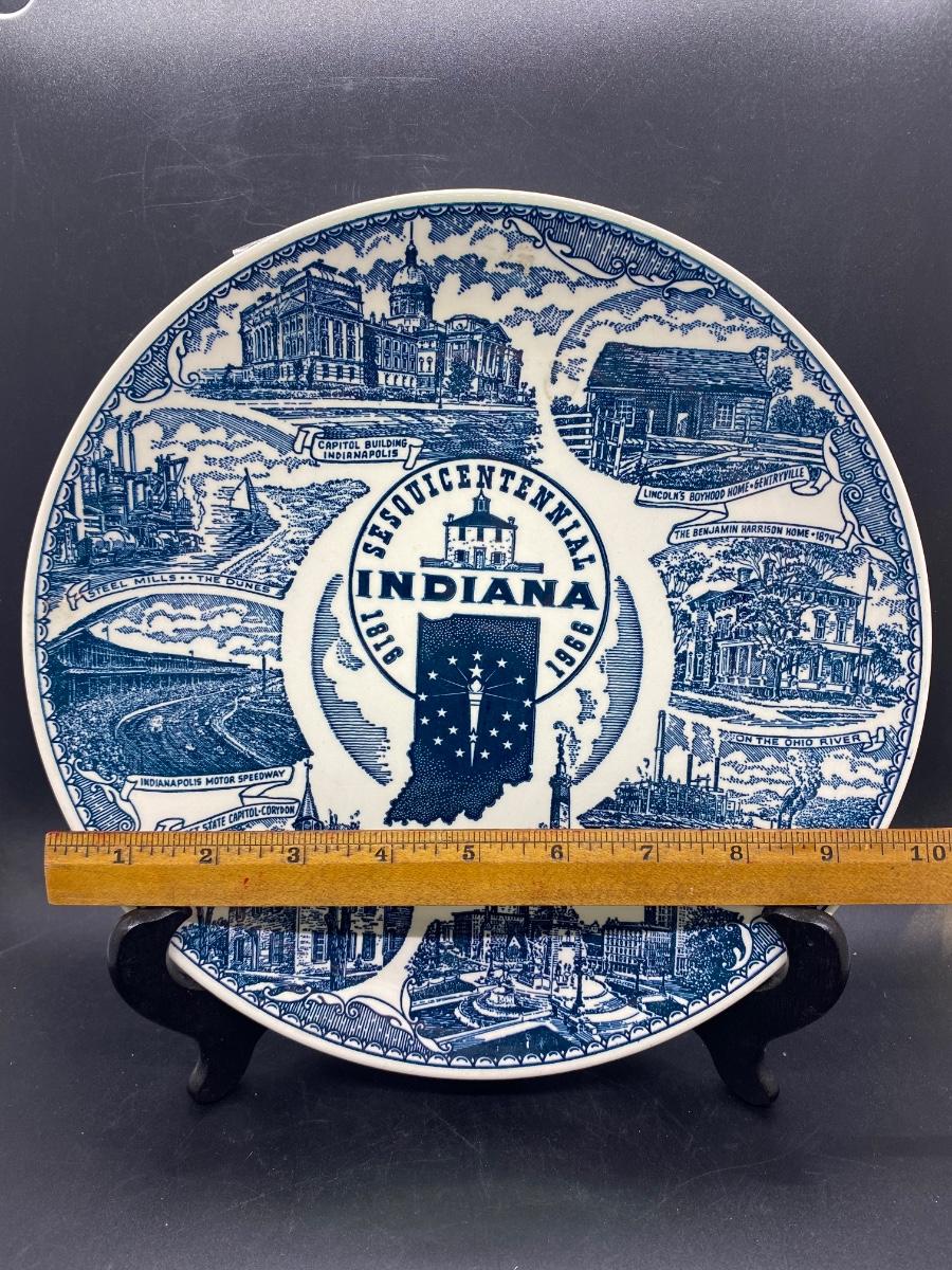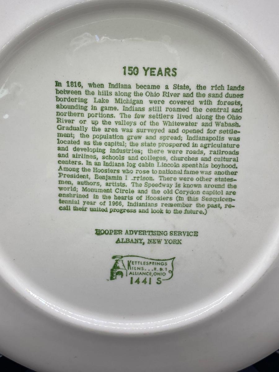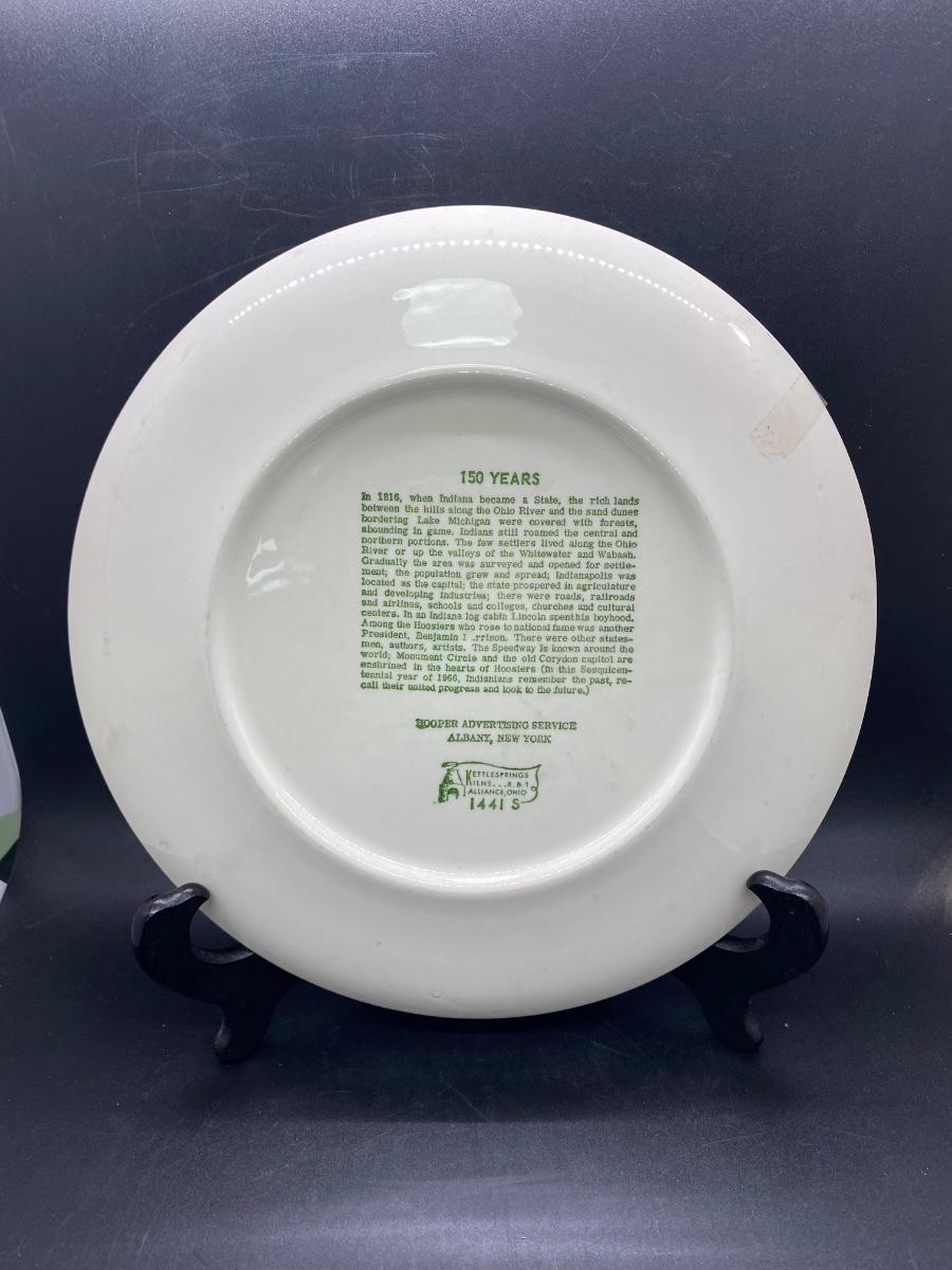 Vintage Indiana Sesquicentennial Collector Plate from Kettlesprings Kilns and Hooper Advertising Service. In good condition. There is an old piece of tape stuck on the edge, I think it may have been to protect plate from plate hanger rack. No chips, cracks, or crazing noticied.