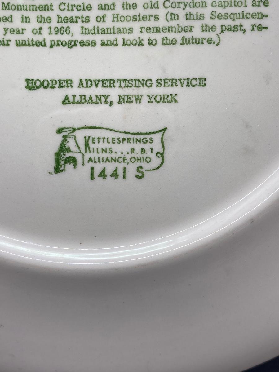 Vintage Indiana Sesquicentennial Collector Plate from Kettlesprings Kilns and Hooper Advertising Service. In good condition. There is an old piece of tape stuck on the edge, I think it may have been to protect plate from plate hanger rack. No chips, cracks, or crazing noticied.