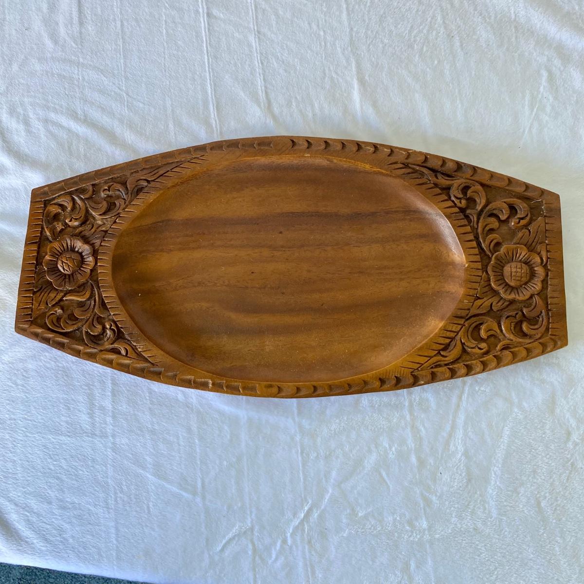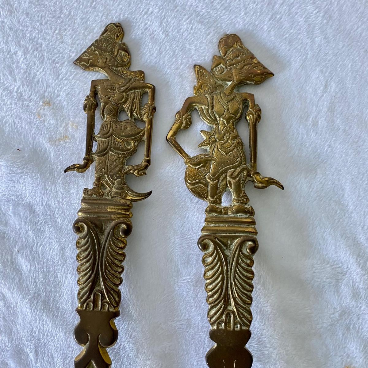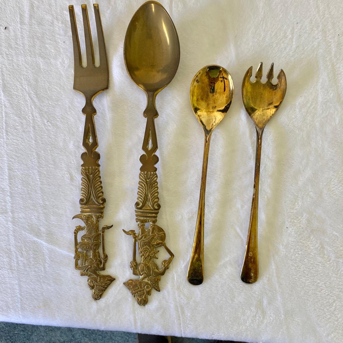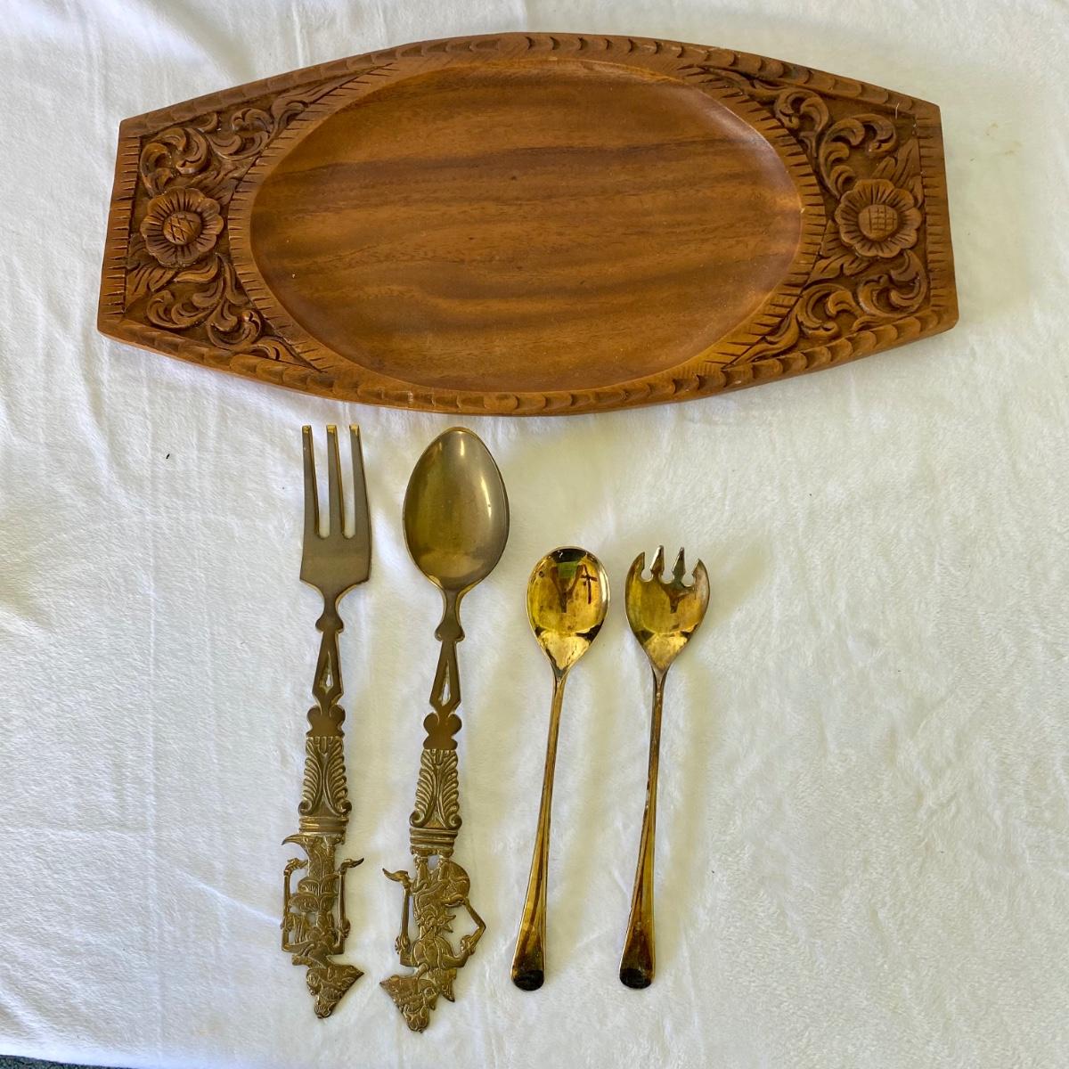 Indonesian style, brass colored serving utensils and hand carved wood serving tray. Tray measures 20”L x 10”W. Larger utensil measure 12.5”L. Good condition.