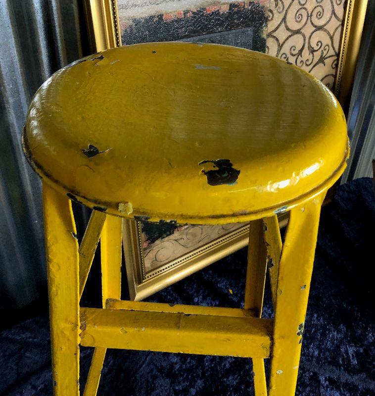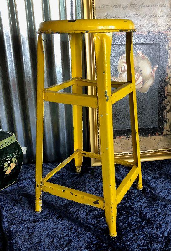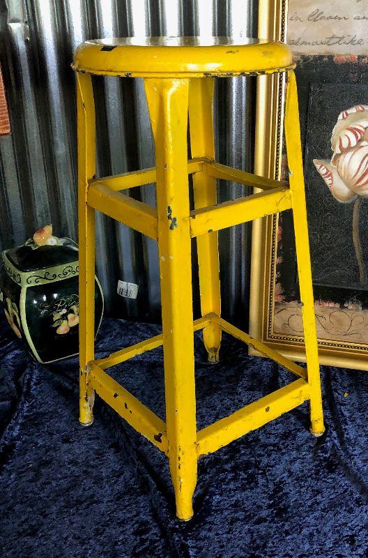 Vintage industrial type stool..metal construction..25" tall...painted yellow...