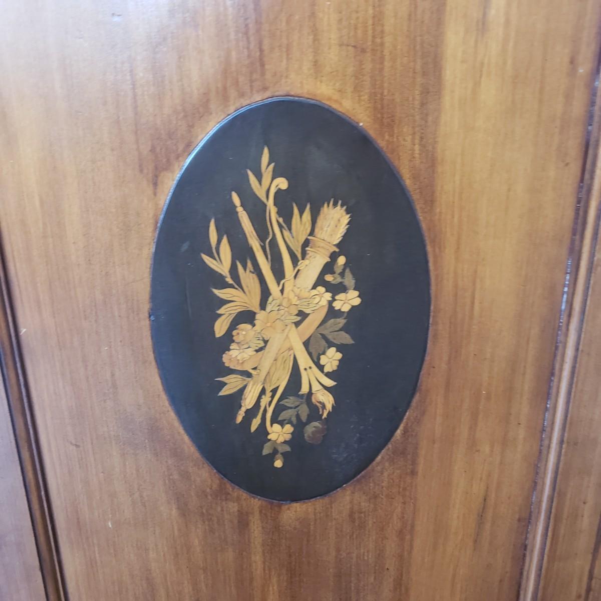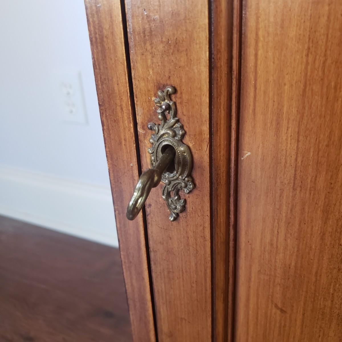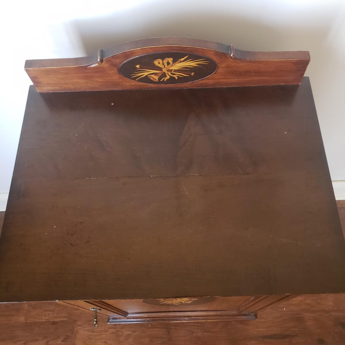This unique cabinet measures 20" x 15" x 27"H. It appears to be an antique sheet music cabinet with two inlay features on the front showing various instruments. There is a lock with a key that works. The two shelves are adjustable by moving the pins to various spots. The shelves have a curve. Please see photos for details. This item is located on the ground floor. There are two exits from this level, each with 4 steps down leading to driveway.