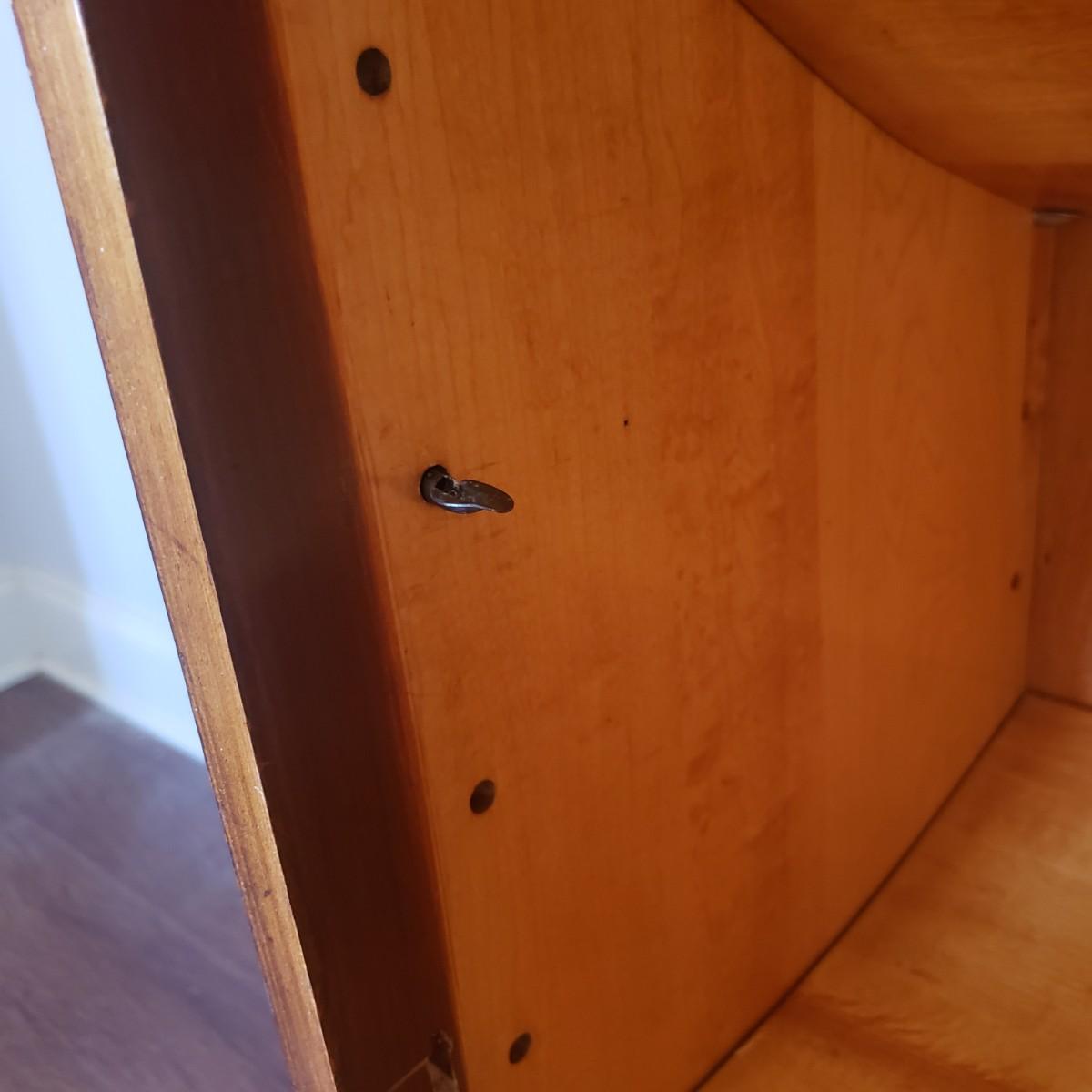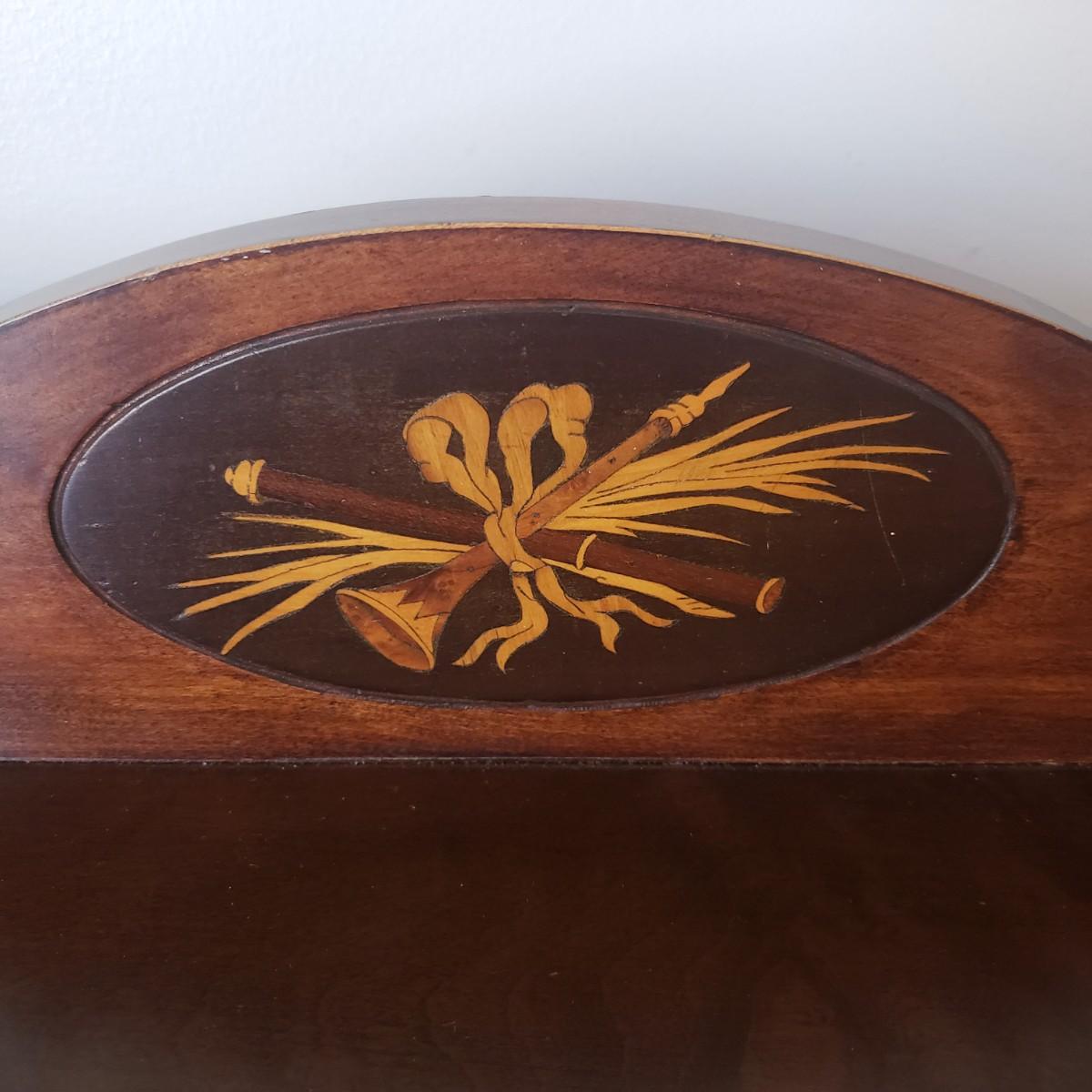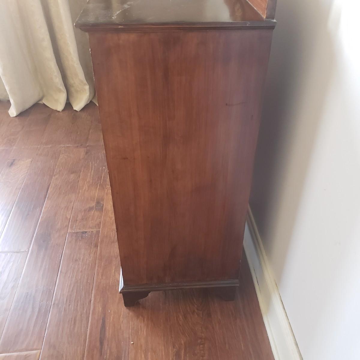 This unique cabinet measures 20" x 15" x 27"H. It appears to be an antique sheet music cabinet with two inlay features on the front showing various instruments. There is a lock with a key that works. The two shelves are adjustable by moving the pins to various spots. The shelves have a curve. Please see photos for details. This item is located on the ground floor. There are two exits from this level, each with 4 steps down leading to driveway.