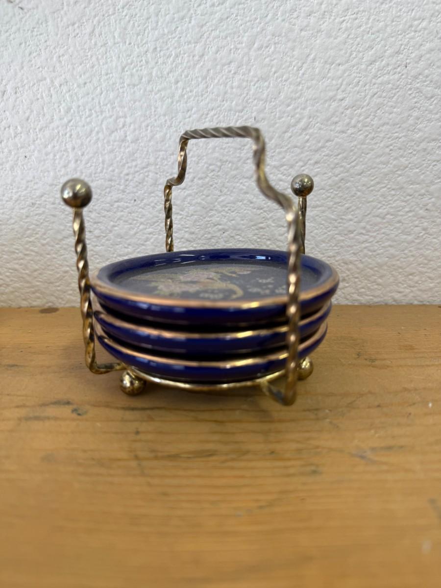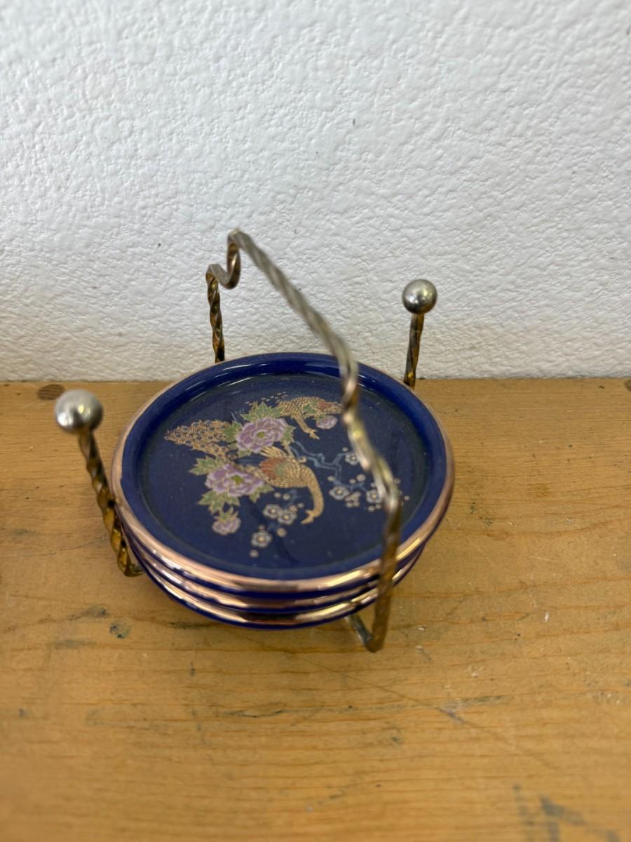 Vintage Interpur Cobalt Blue Peacock Set 3 Coasters and Caddy Holder