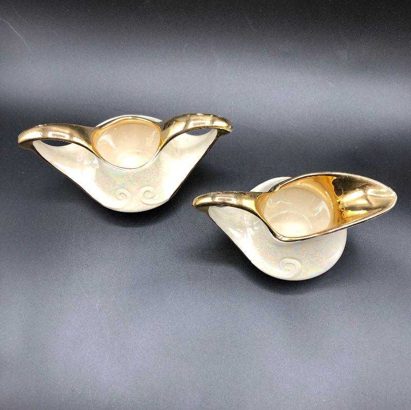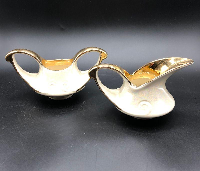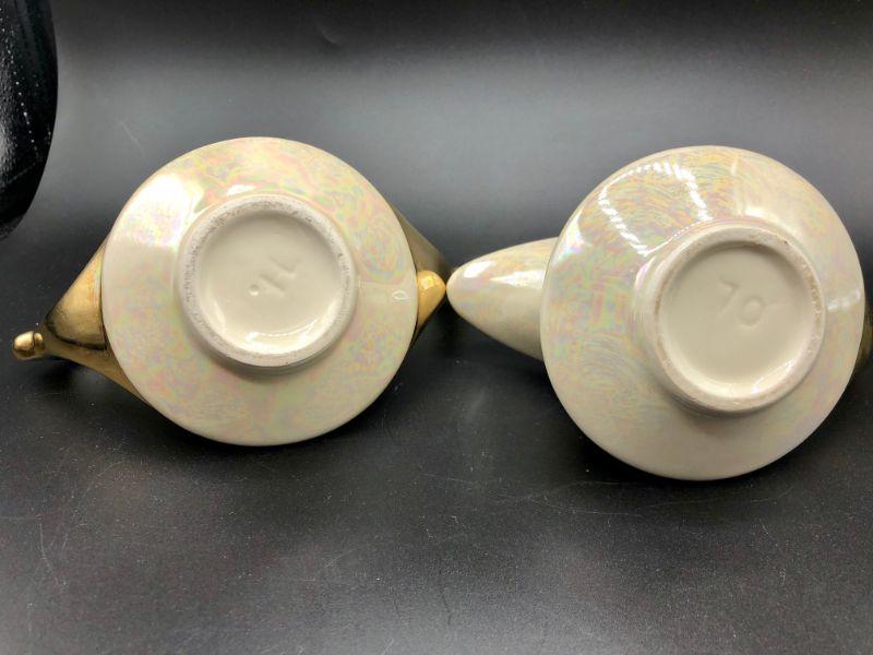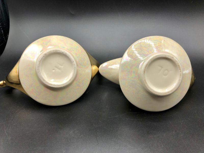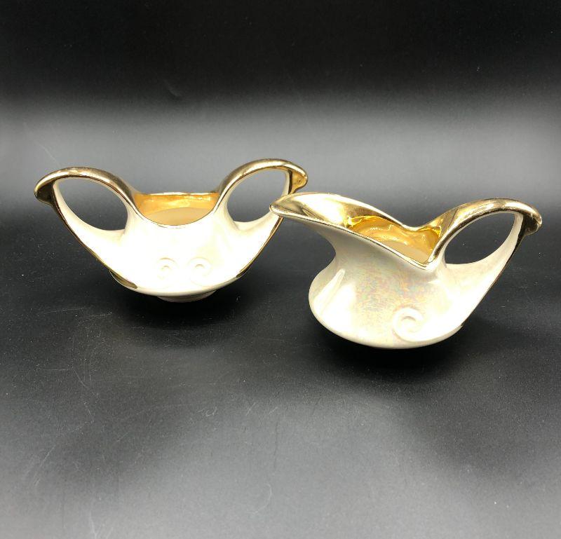 Vintage iridescent cream & sugar set. Wonderful shape & curve. Gold inside and on handle tops. Both pieces have a swirl design in the sides. Number markings on the bottoms, no maker mark. Good Condition.