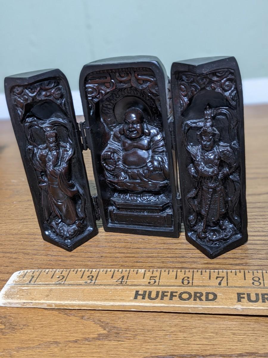 Vintage Resin Cylinder Buddha Shrine with Hinged Folding Panels, Exc Condition