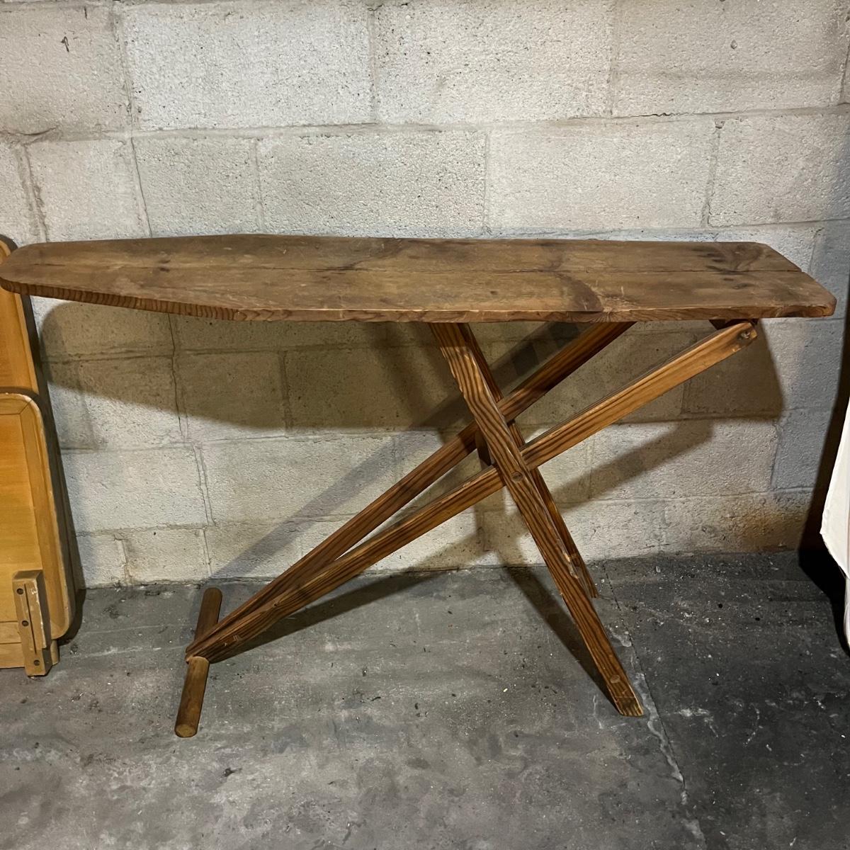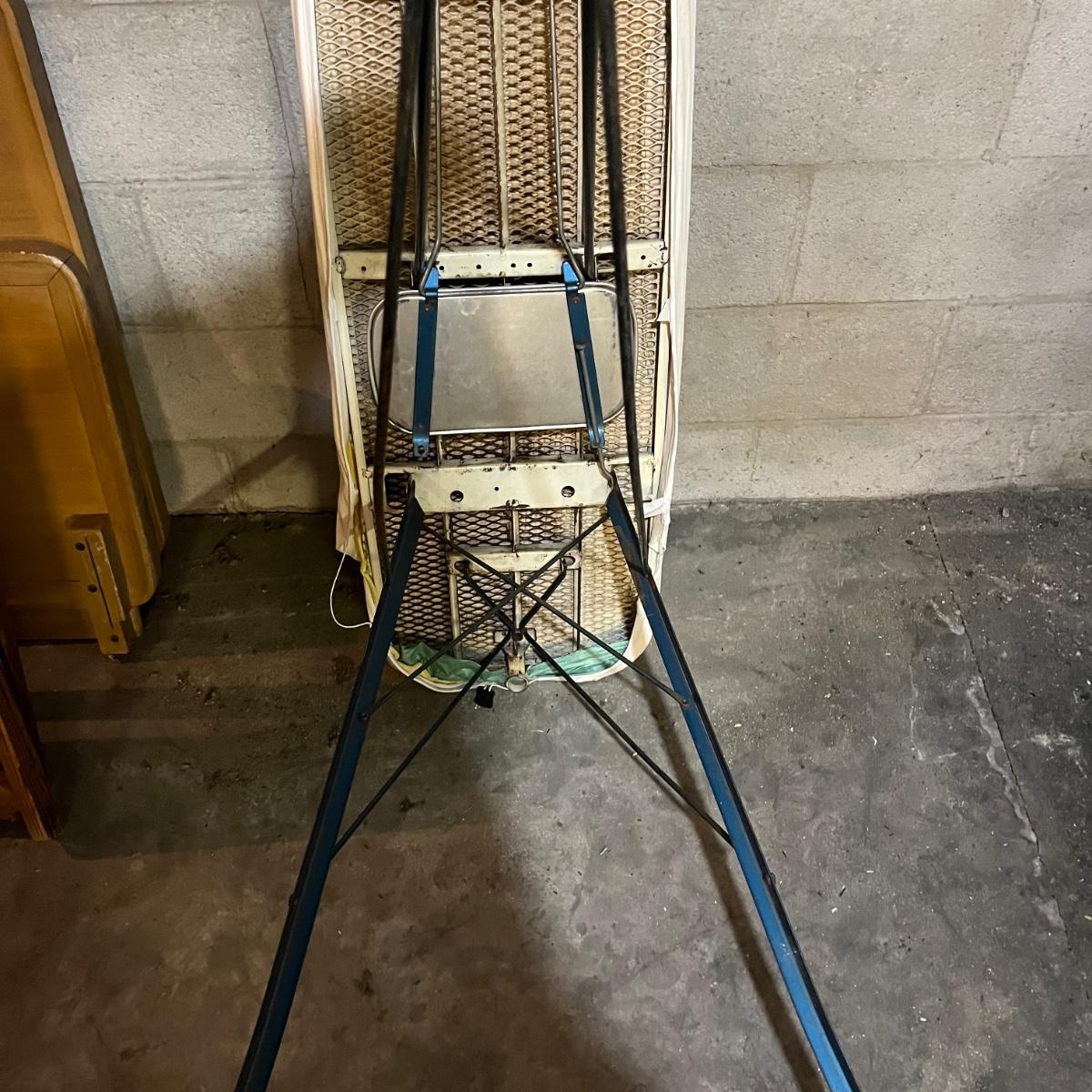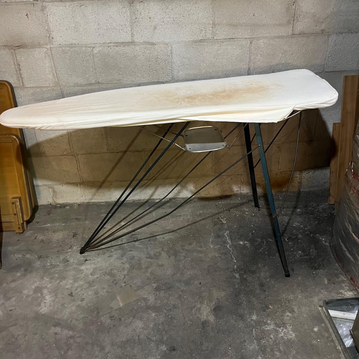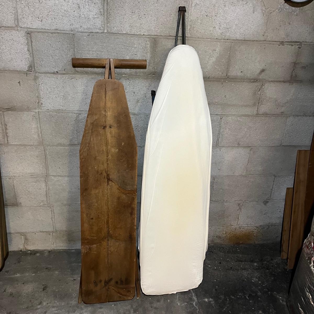 Lot contains one wooden ironing board and a heavy metal ironing board with cover. Metal board measures 14” x 55” x 33”.