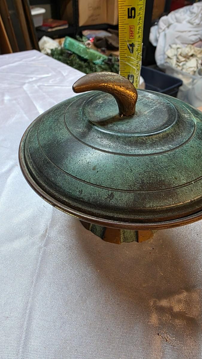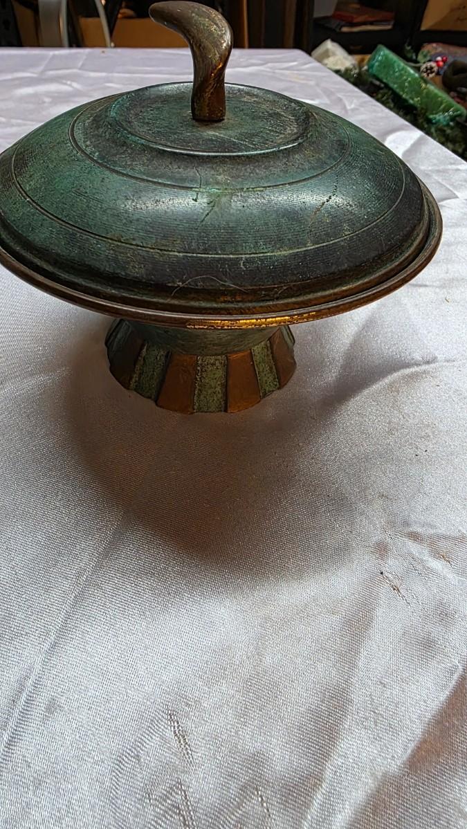 Vintage Israeli Verdigris Brass Lidded Bowl – Sculptural Mid-Century Pedestal Dish