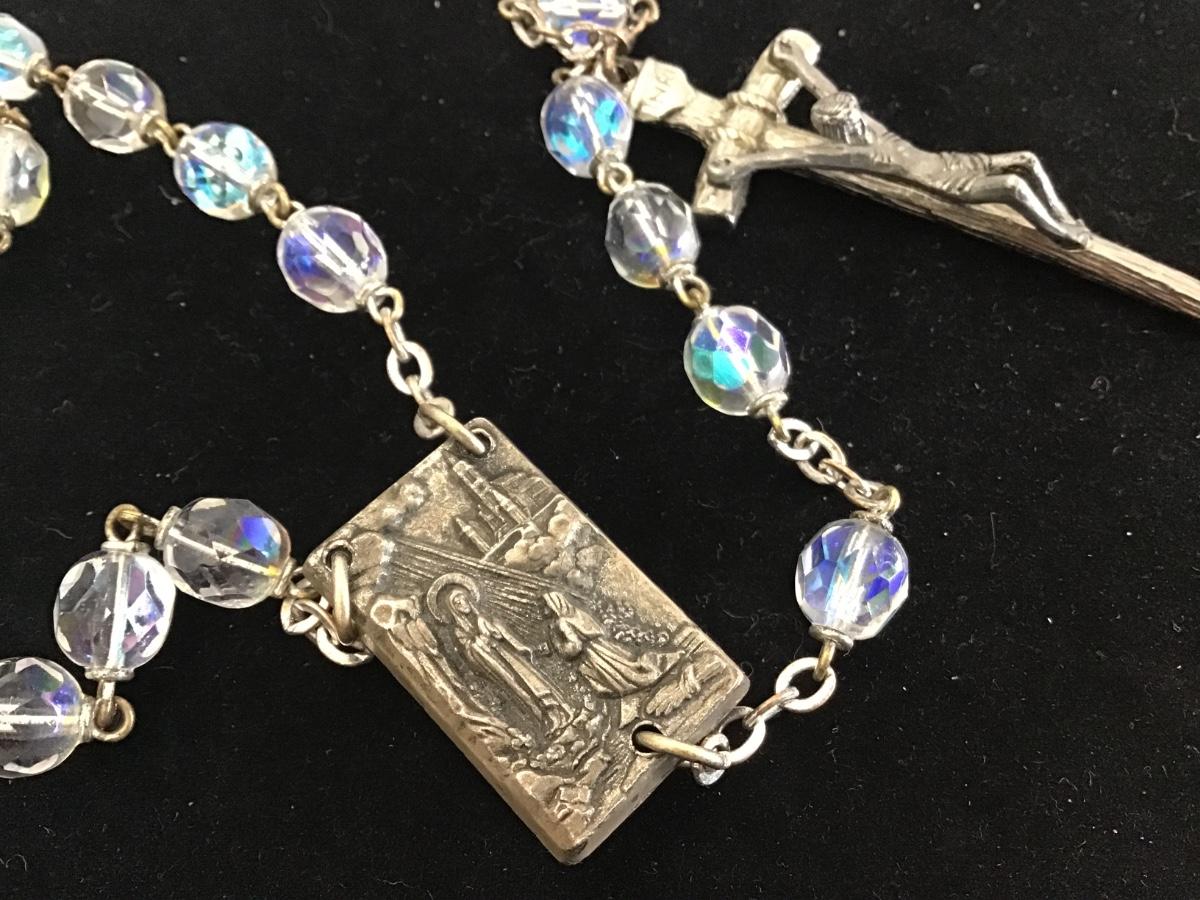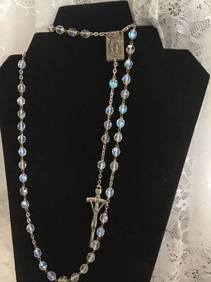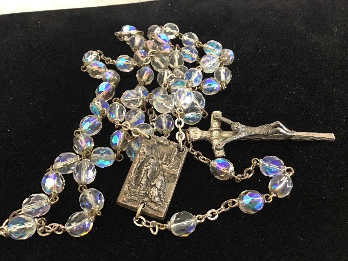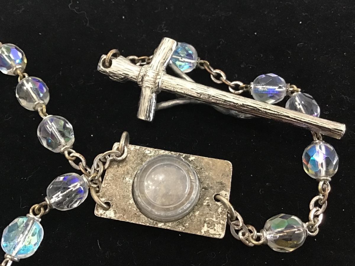 VINTAGE Italian AURORA BOREALIS CATHOLIC Glass Bead ROSARY 22" With Relic