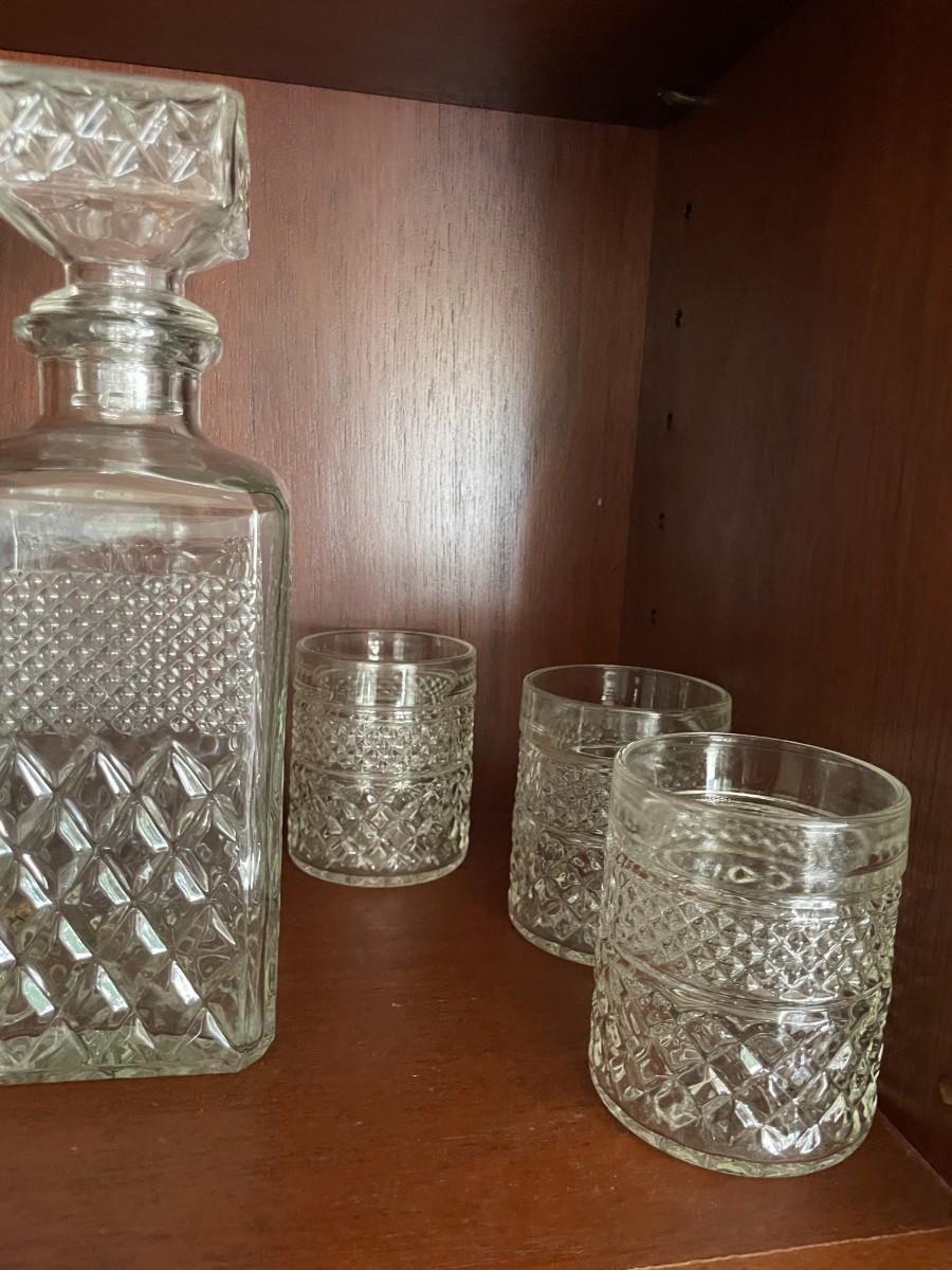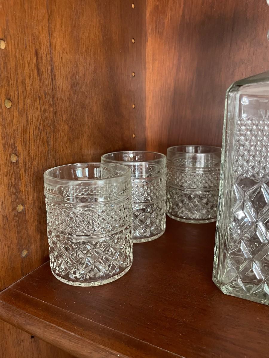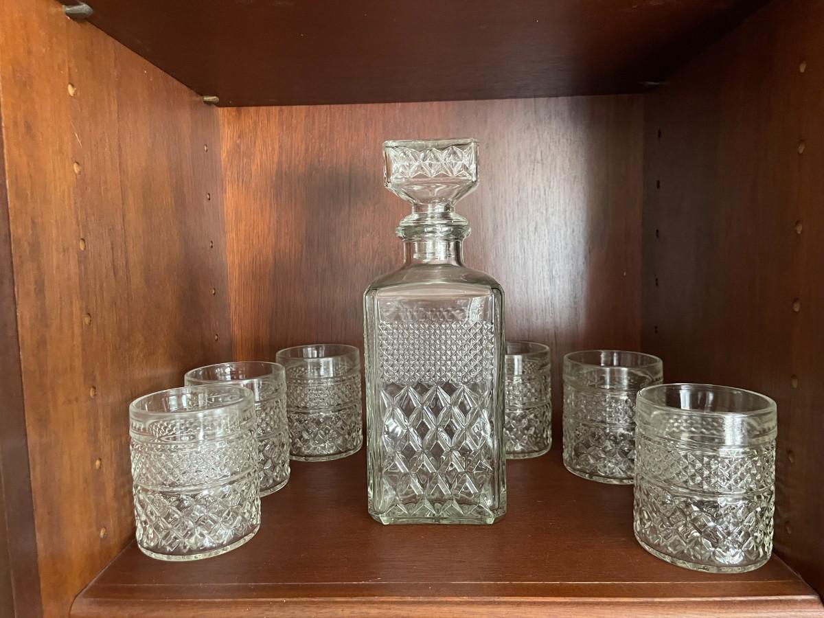 1 Decanter and 6 Glasses. All in great condition. Decanter measures 3 1/2W x 9 1/2h and Glasses are 2 1/2W x 3 1/4H