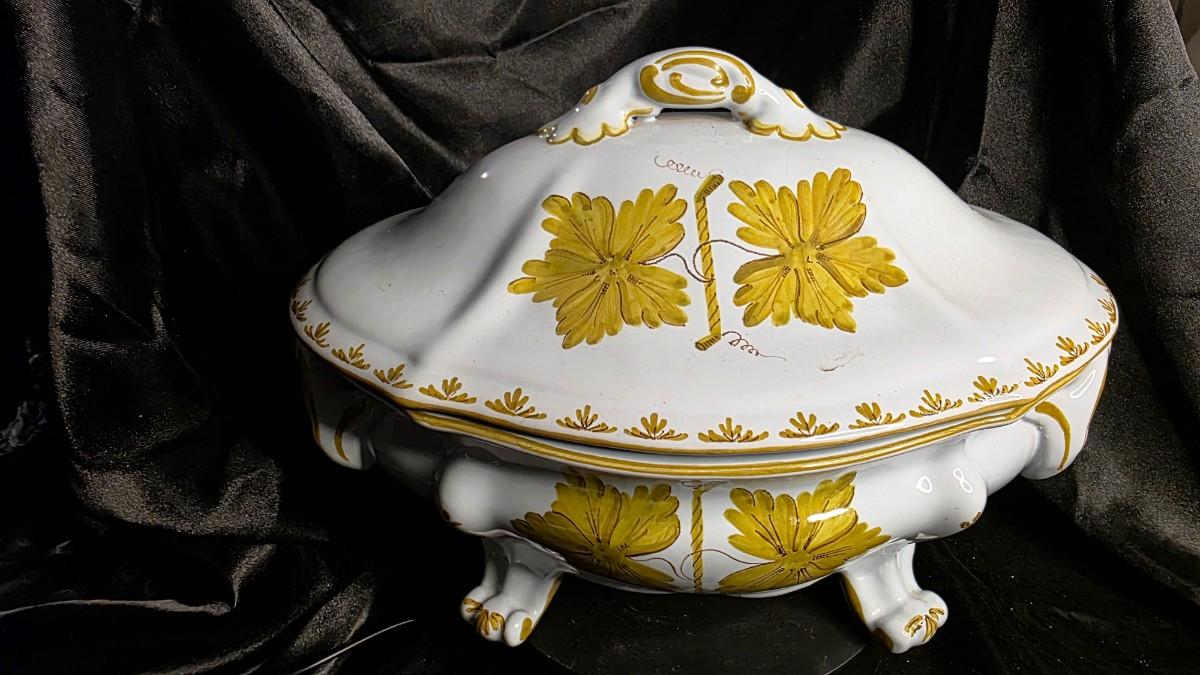 Majolica of this style is strongly associated with Italian pottery centers such as Faenza and Nove, and closely aligns with mid-century works influenced by renowned makers like Guido Gambone. Whether displayed as a statement object or incorporated into a curated collection of European ceramics, this tureen offers timeless presence, texture, and provenance-driven appeal.
