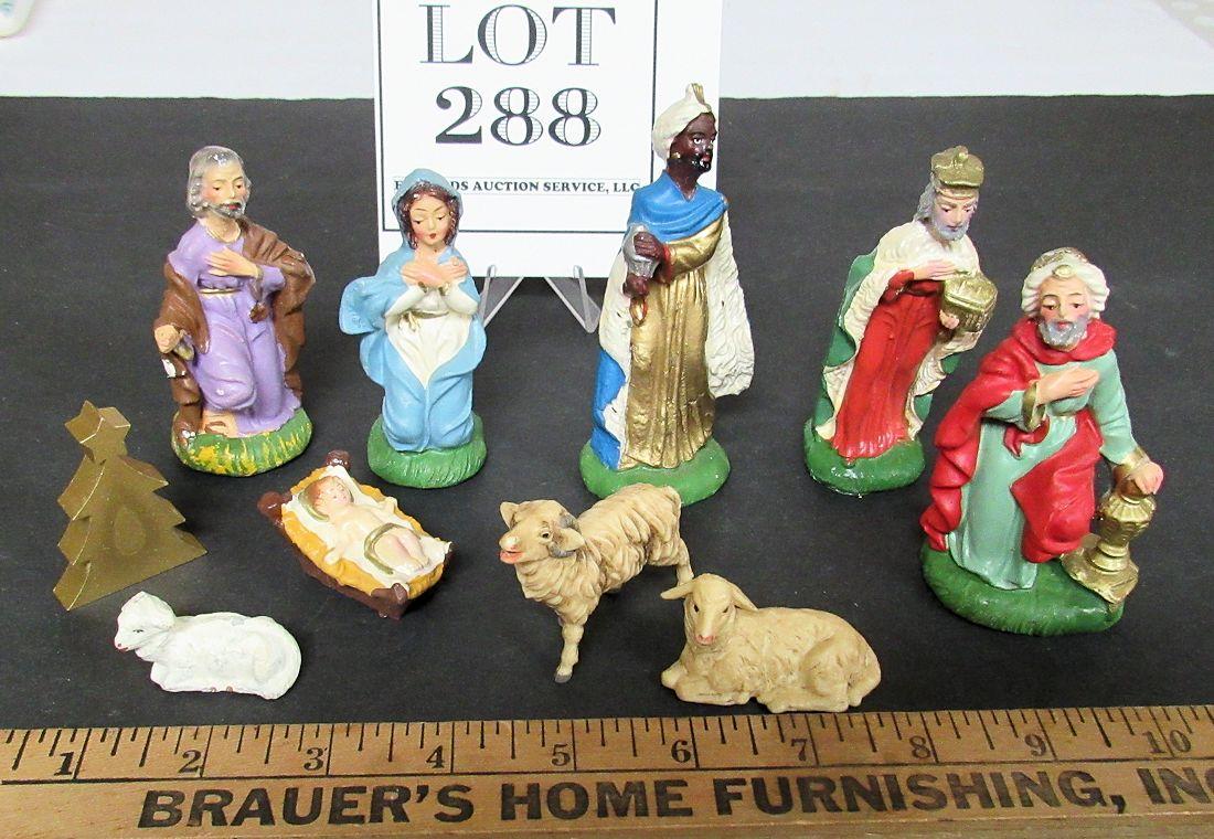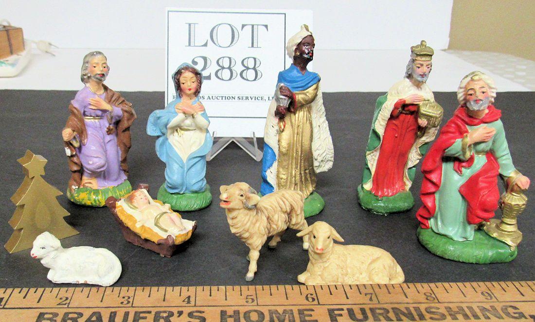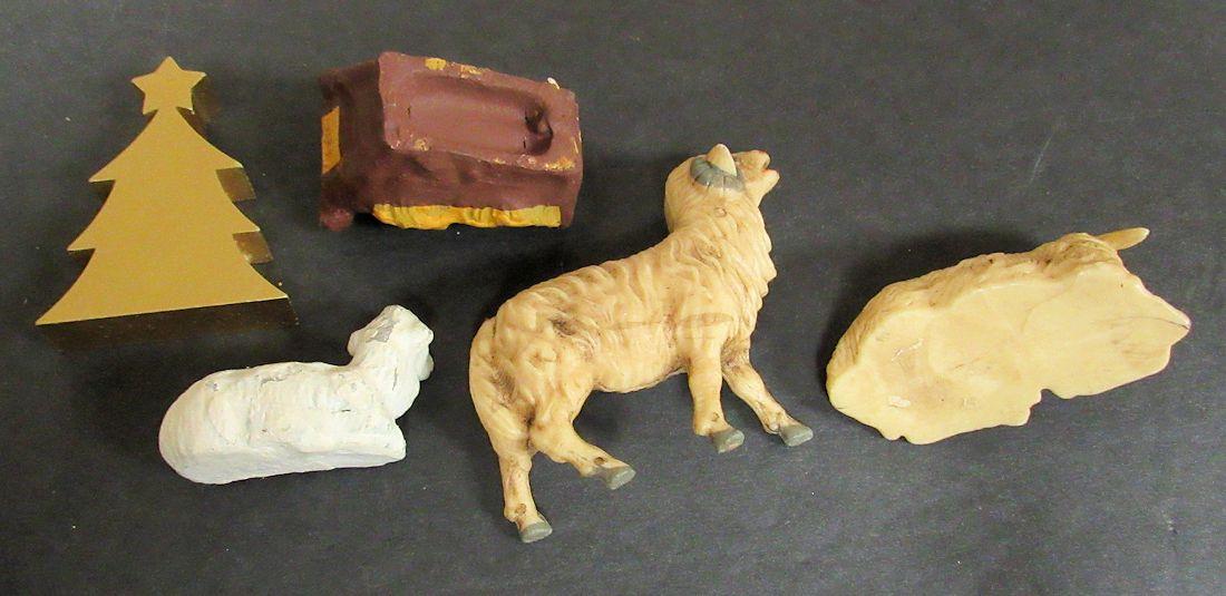 All are in good condition but Josef figure has a chip in the paint on the side. The figures are like plaster and the sheep are plastic of some kind. Shipping is available at shipping cost plus $5.00 handling fee on up to 6 lots, $10.00 handling fee on 7 or more lots or two boxes. $15.00 handling fee on 3 boxes. Helps cover shipping materials and labor cost.