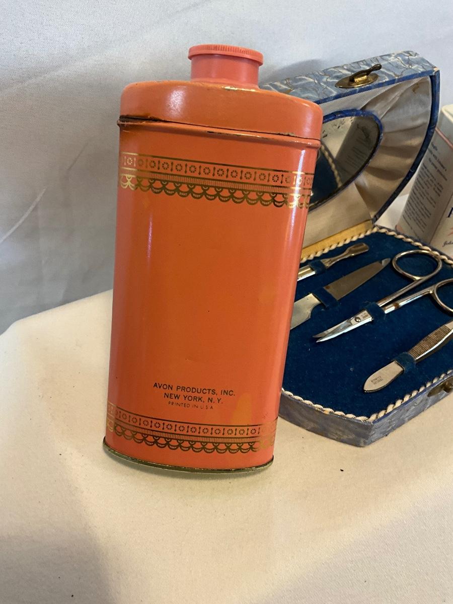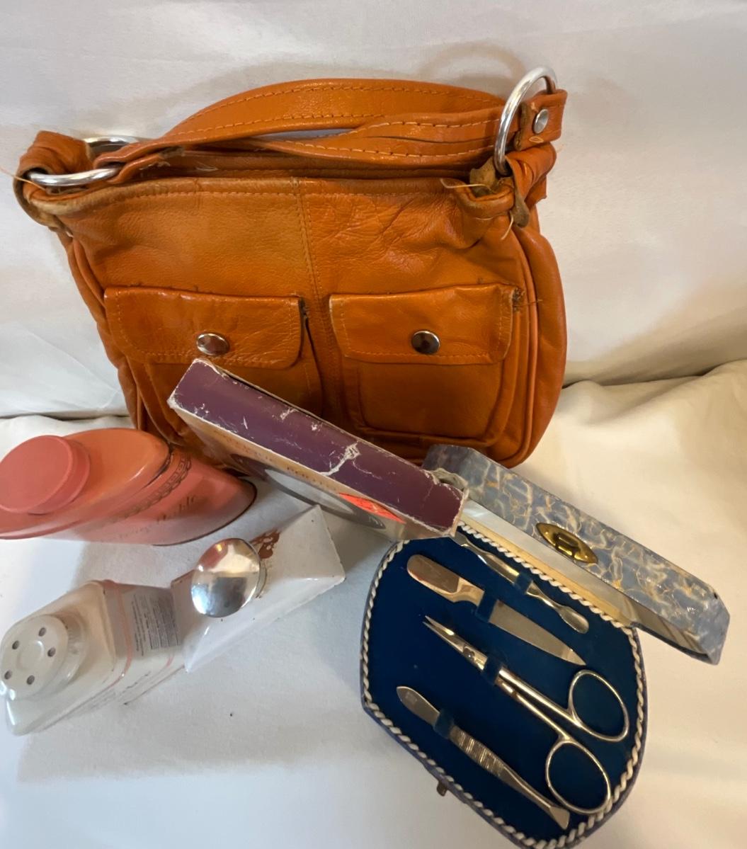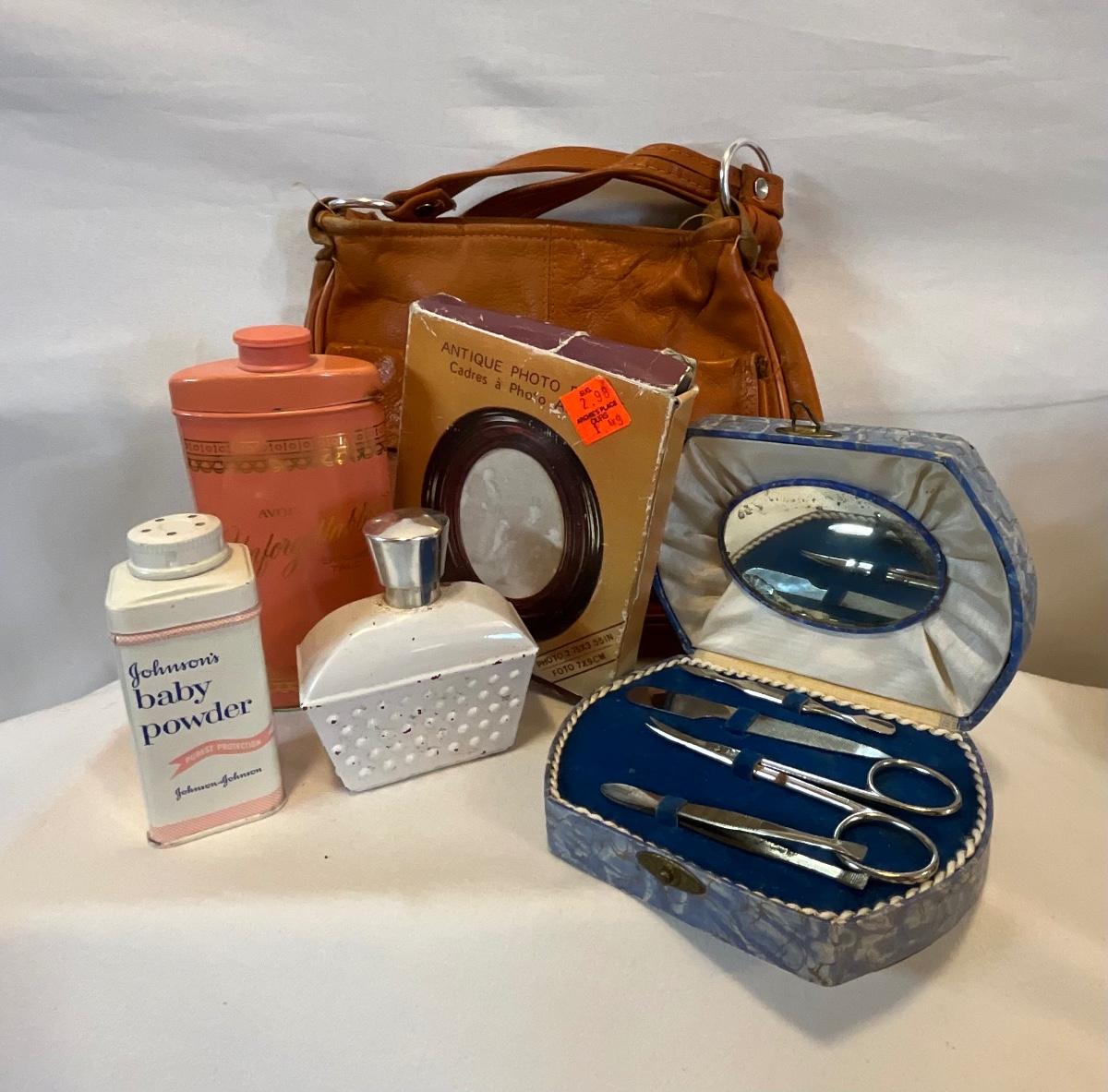 Leather purse, vintage baby powder, vintage frame, vintage perfume bottle, vintage Avon bottle, and vintage nail set.