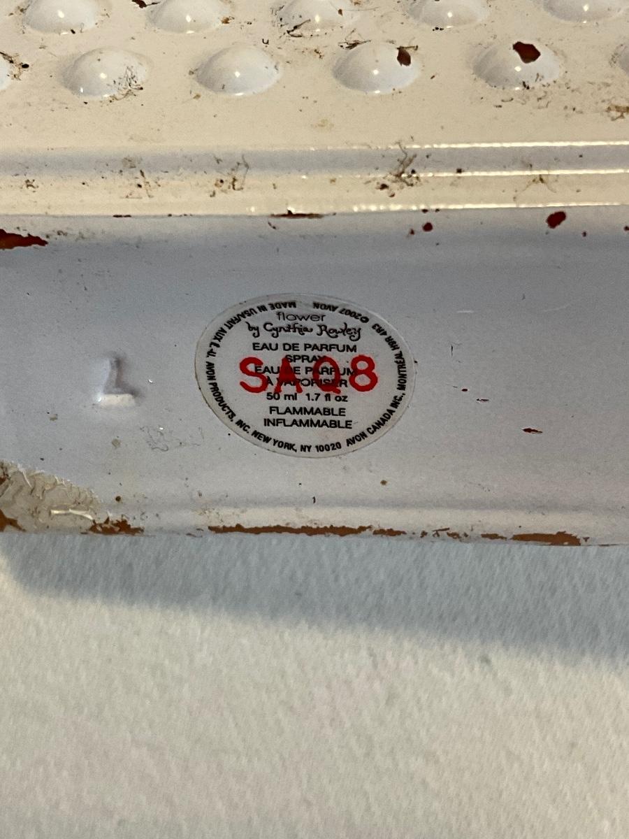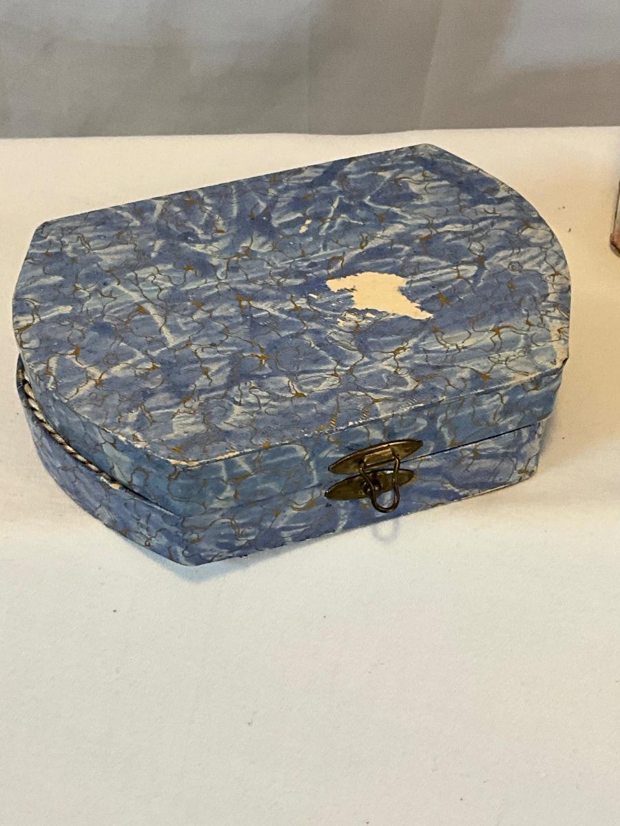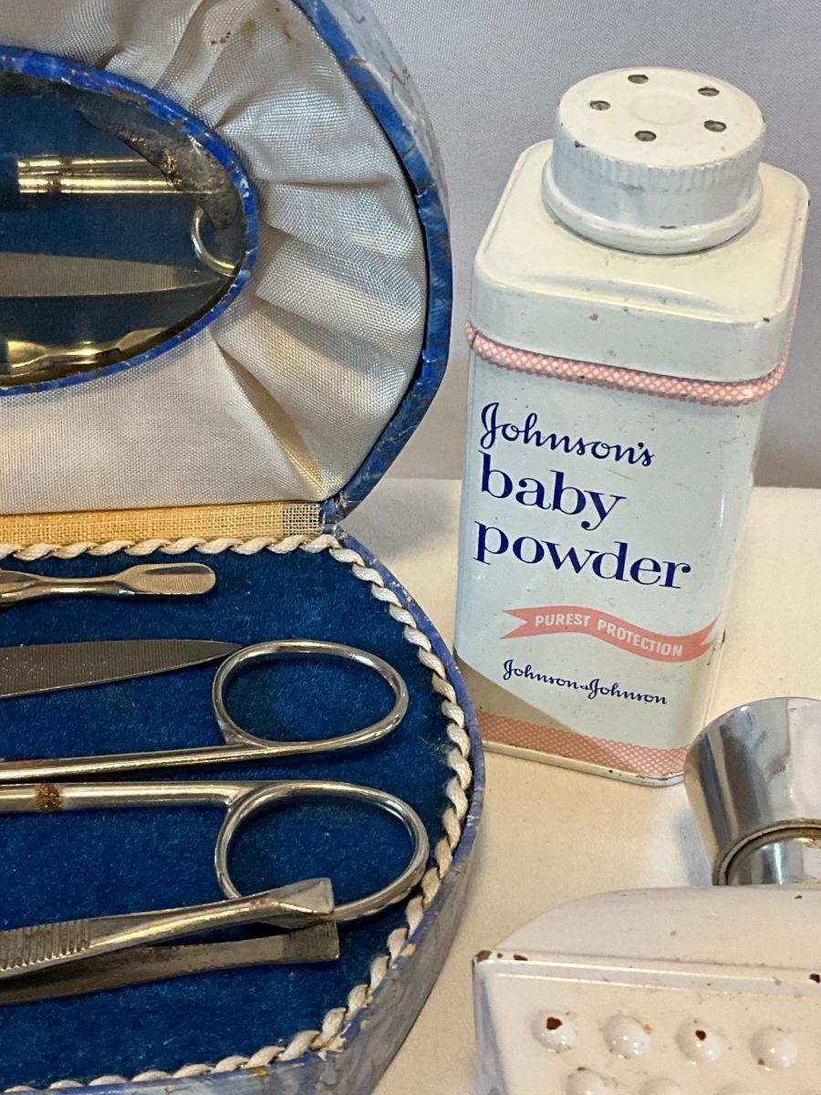 Leather purse, vintage baby powder, vintage frame, vintage perfume bottle, vintage Avon bottle, and vintage nail set.