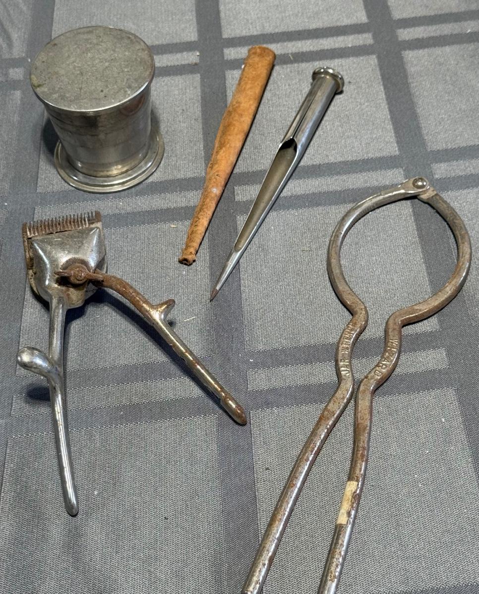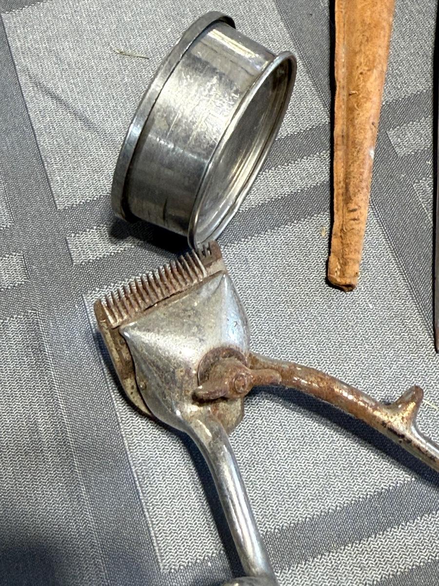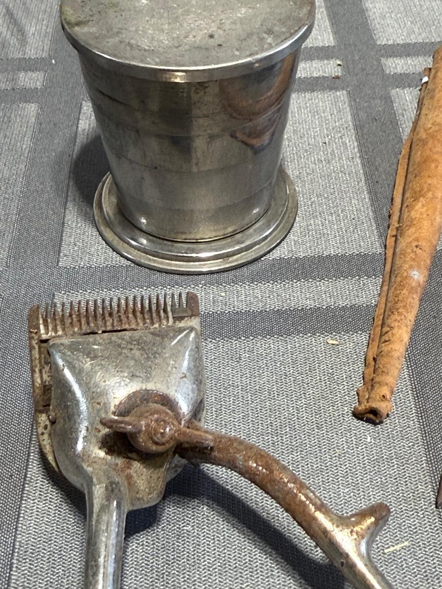 Vintage items, flour tester, collapsible metal cup, hair clipper, Jar wrench tool.