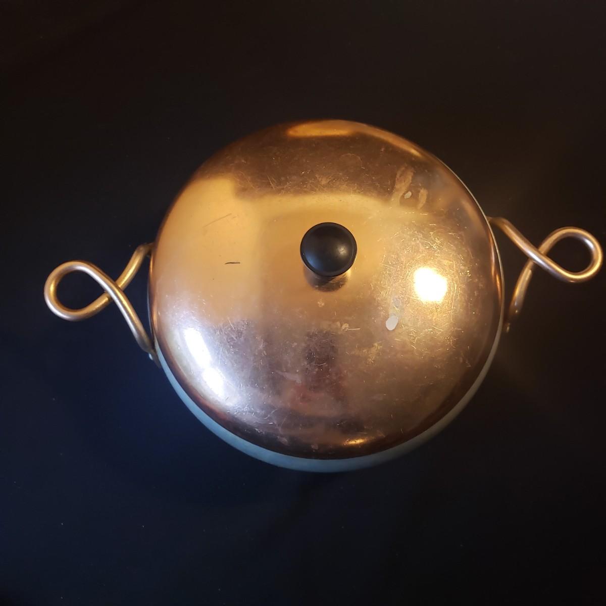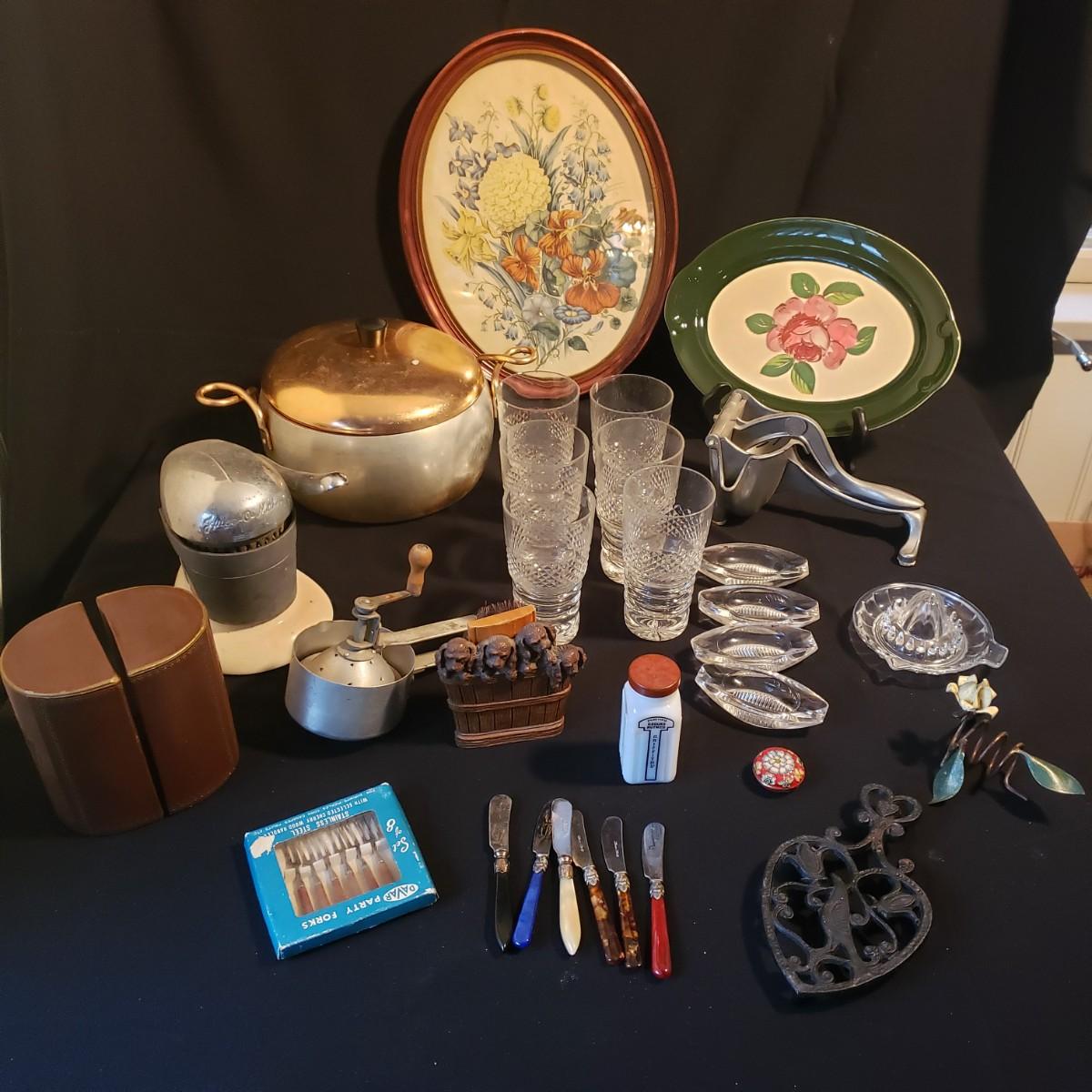 This fun vintage lot has something for everyone! Whether it's a six-piece glass set, Taylor Smith rose platter (10" x 13.5"), copper colored top Hallite Ware-Ever pot or a milk glass nutmeg spice bottle, this lot will take you back! See pictures for details.