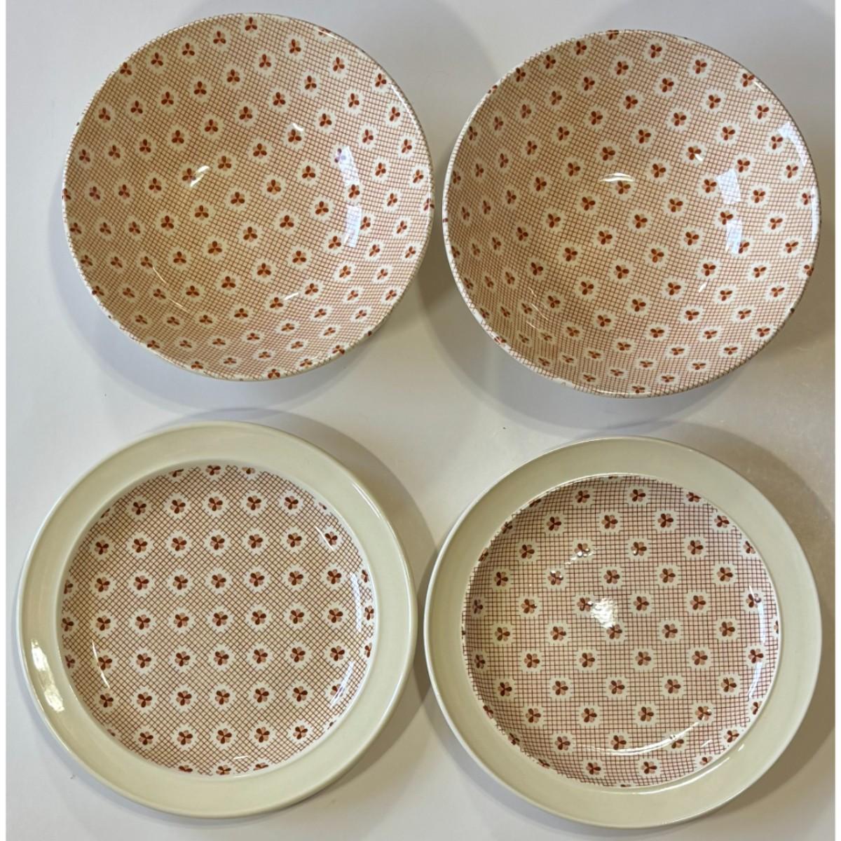 You get two plates and two bowls - all pieces are in good condition with minor surface wear. The plates have an approximately 7 1/8" diameter. The bowls stand roughly 1 5/8" tall and have a 6.5" diameter. Please see all pictures. Thank you for looking. As a reminder, if this is a lot, we do not break up lots. Also, all items are prepacked, so each item is sent individually. Any item that qualifies for media mail and weighs over one pound will be shipped via media mail. Otherwise, the item will be shipped USPS ground advantage, or UPS ground. Shipping for this item is $13.00. Items ship within two days after payment is received. Item SKU is OTH3232.