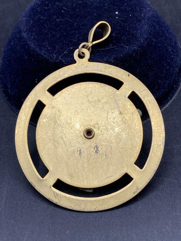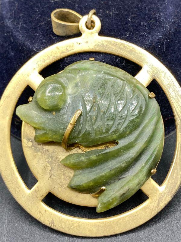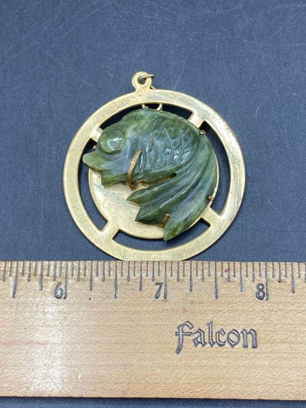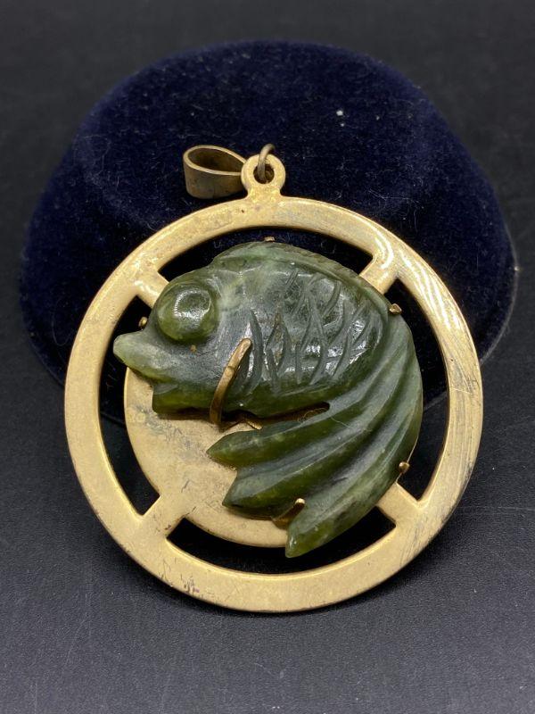 Vintage jade fish pendant. Large goldtone metal backing holds carved jade fish. Metal has discolor/haze from age, but seems to clean with effort. Almost 2" size.