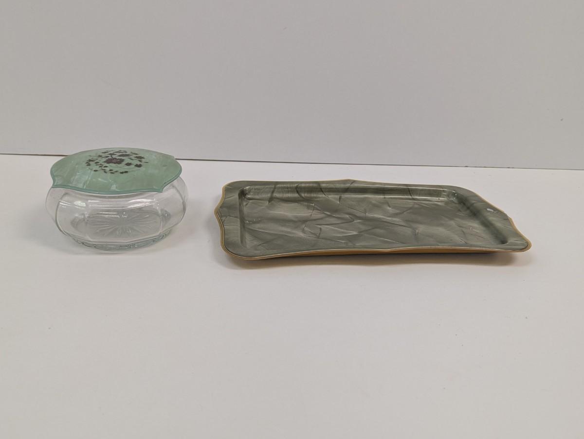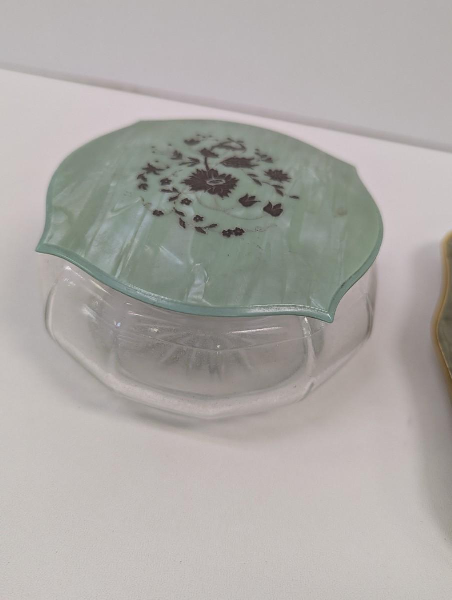 Vintage Jade Green Amber Celluloid Vanity Tray & Art Deco Powder Jar