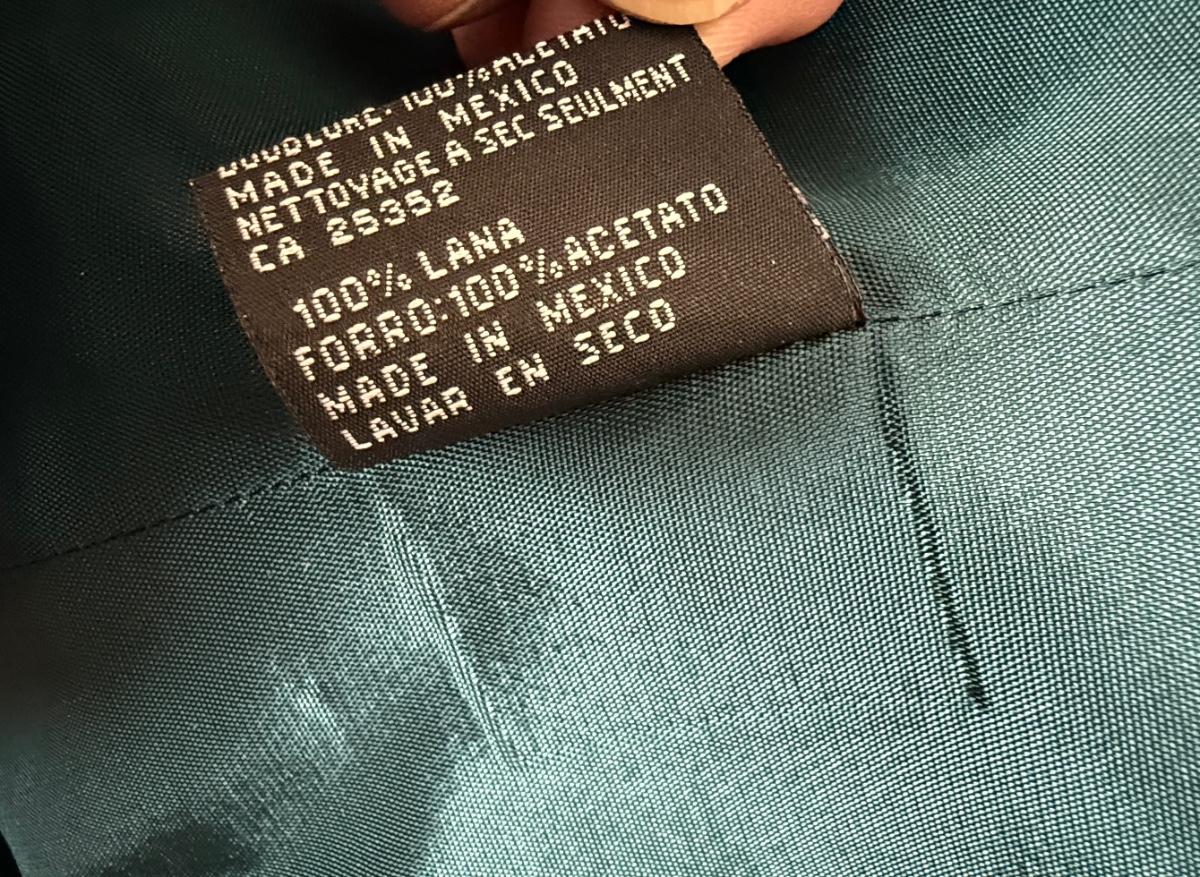 100% wool, dry clean only. In very good used condition.