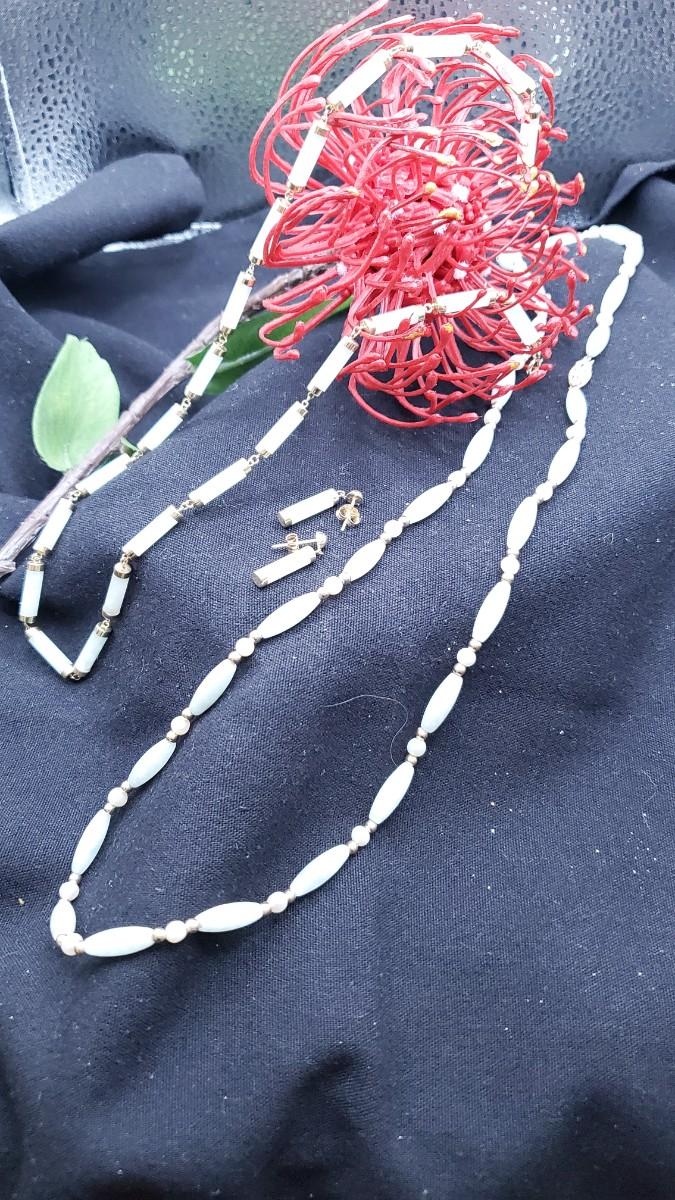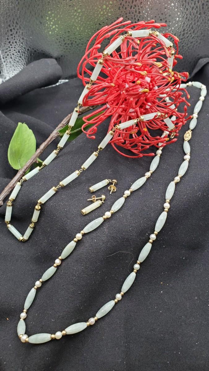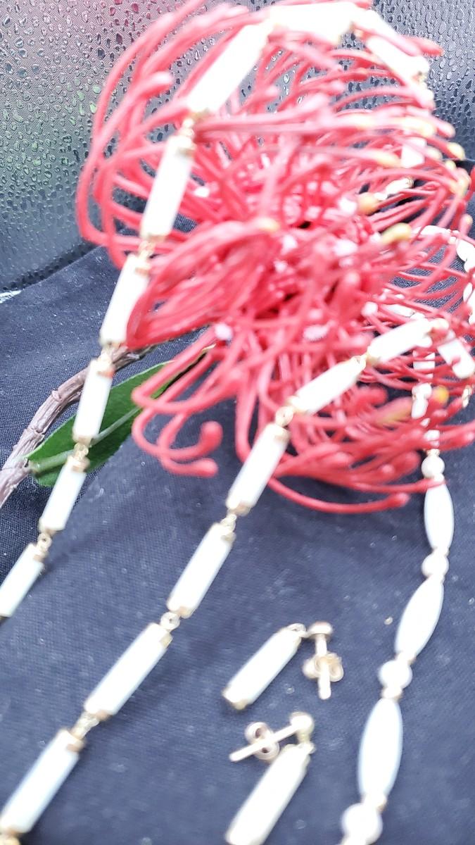 Four beautiful matched pieces include a 25" necklace, an 18" necklace, and lovely pierced earrings.