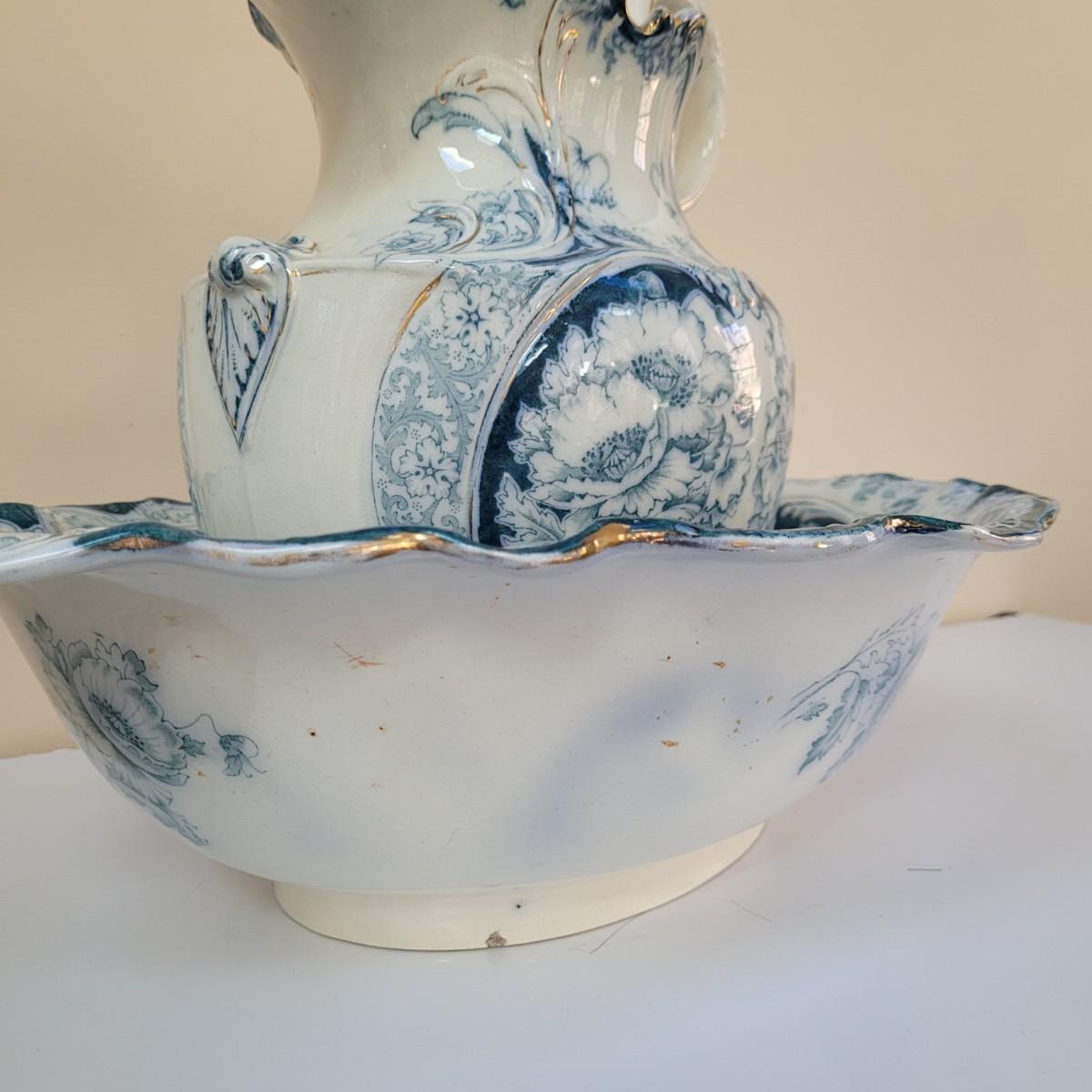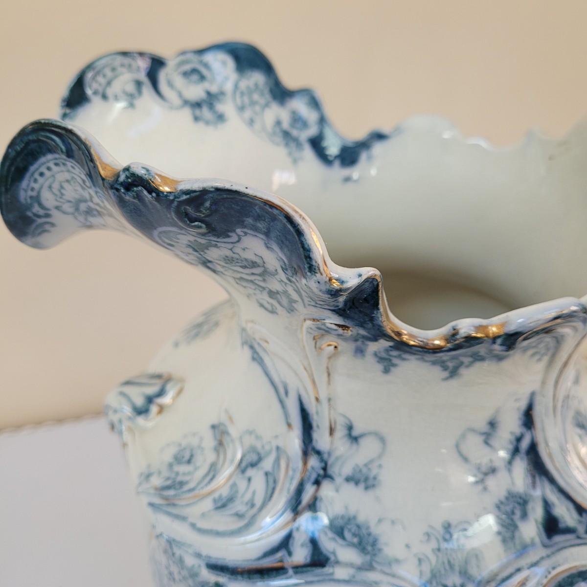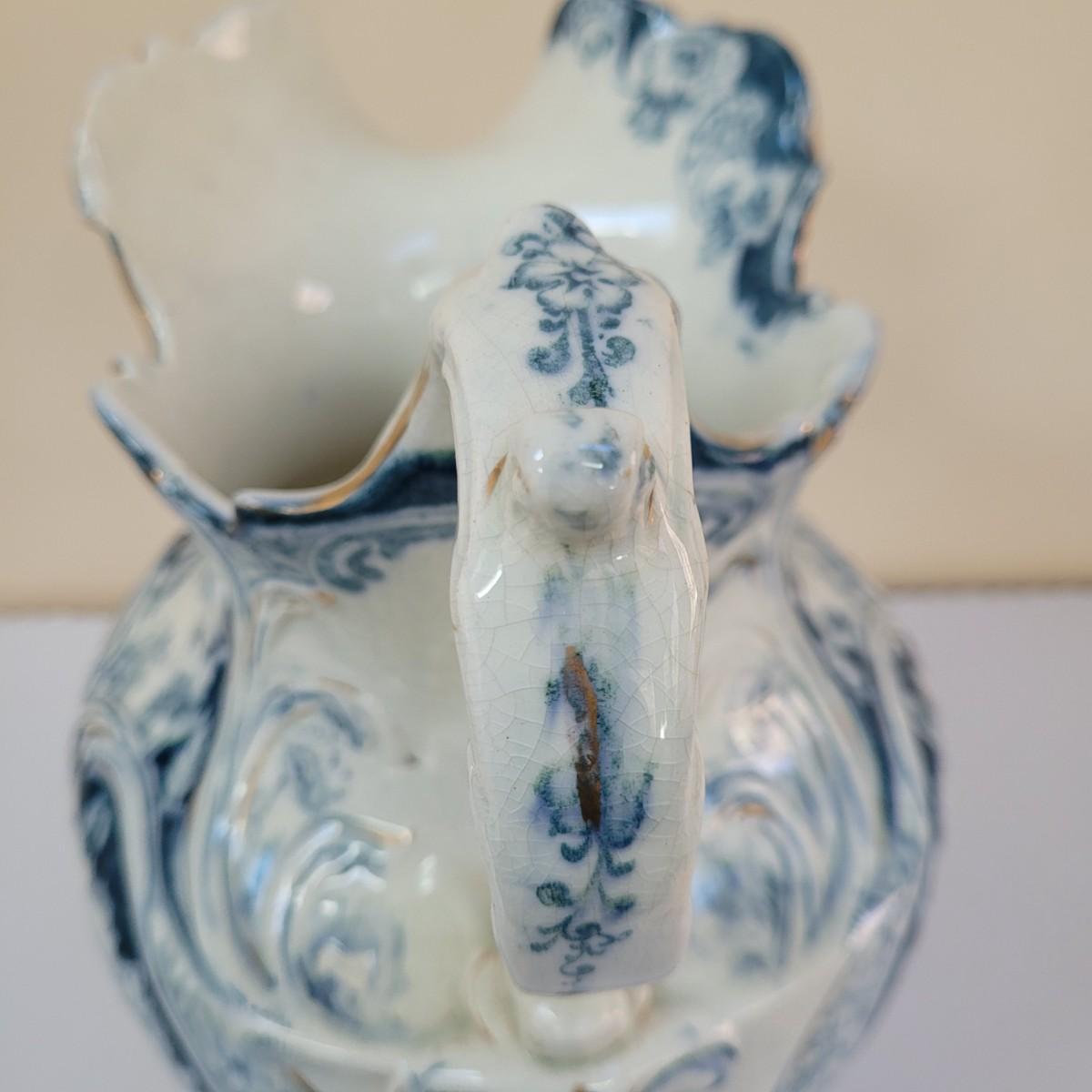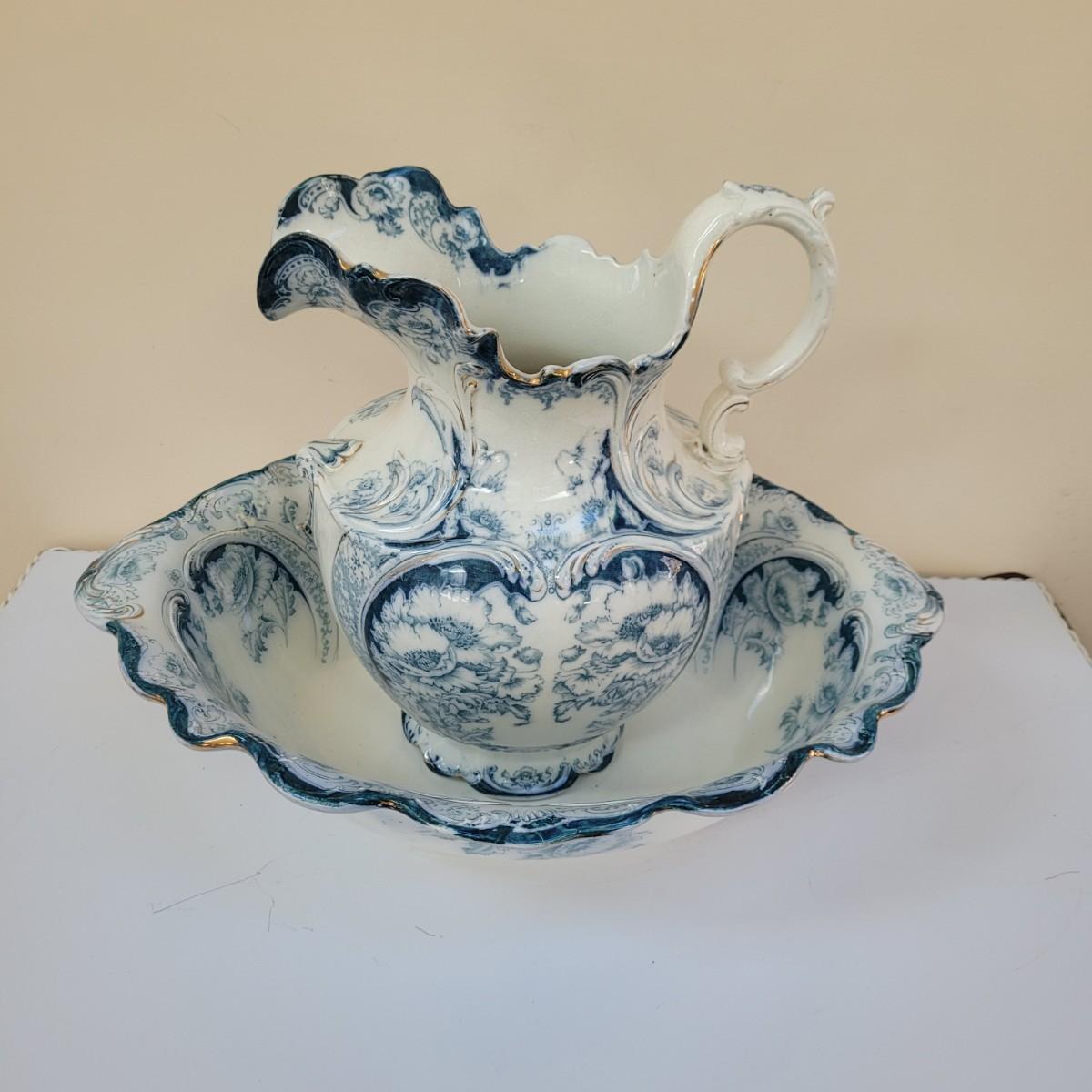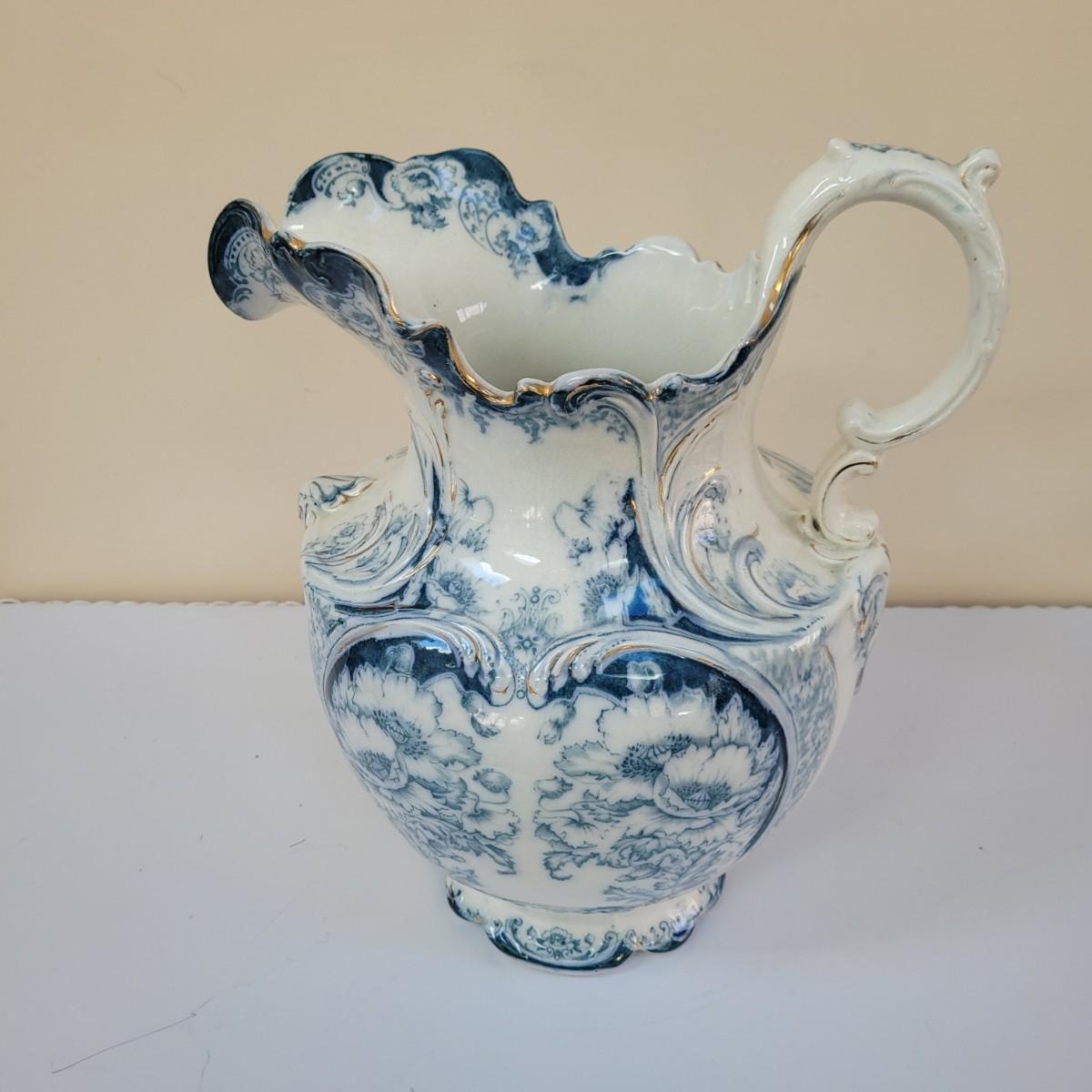 James Kent Old Foley Longton blue floral large pitcher and bowl. Raised floral relief with gold colored painted accent throughout. Chipping in ceramic and paint in some areas (see photos). Pitcher measures approximately 10"d x 13". Shipping available.