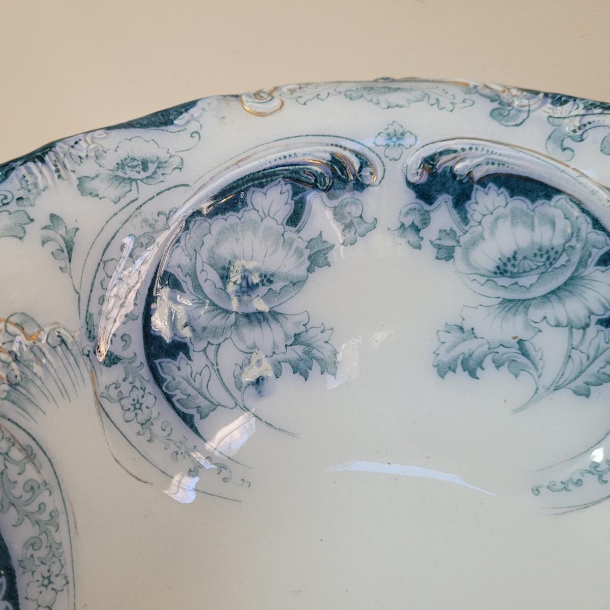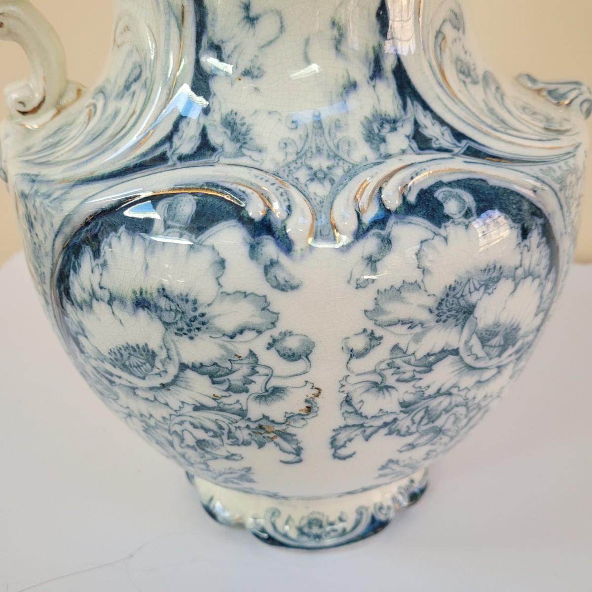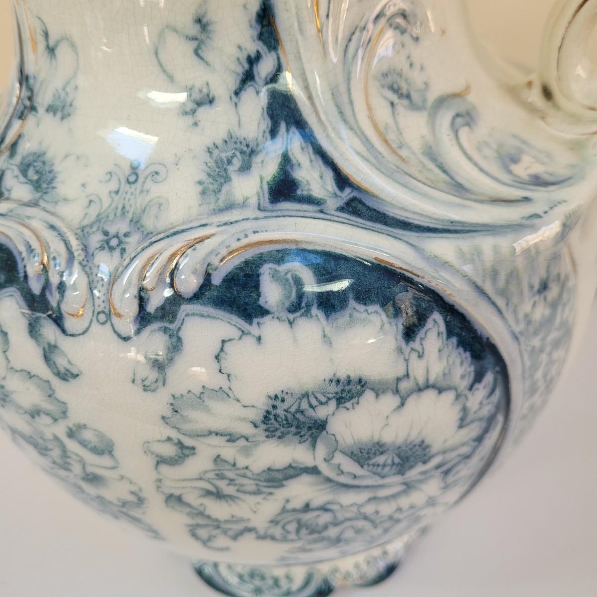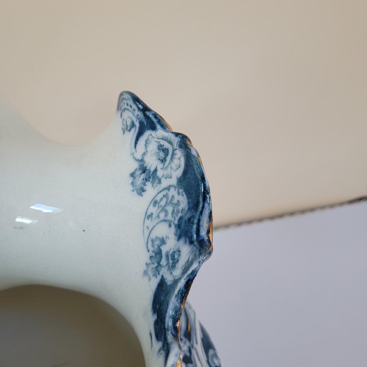 James Kent Old Foley Longton blue floral large pitcher and bowl. Raised floral relief with gold colored painted accent throughout. Chipping in ceramic and paint in some areas (see photos). Pitcher measures approximately 10"d x 13". Shipping available.