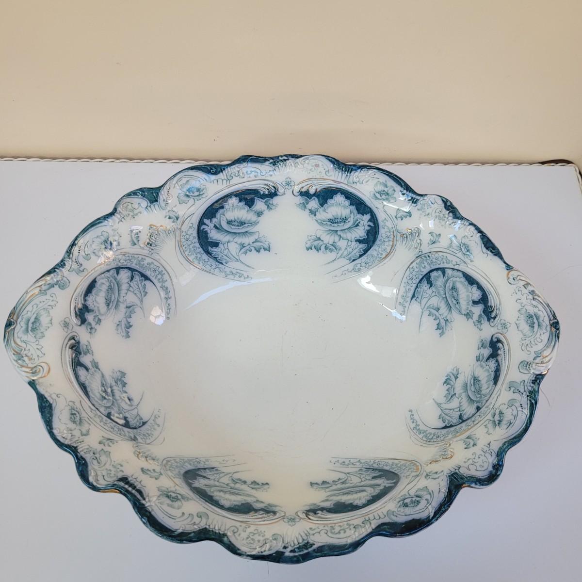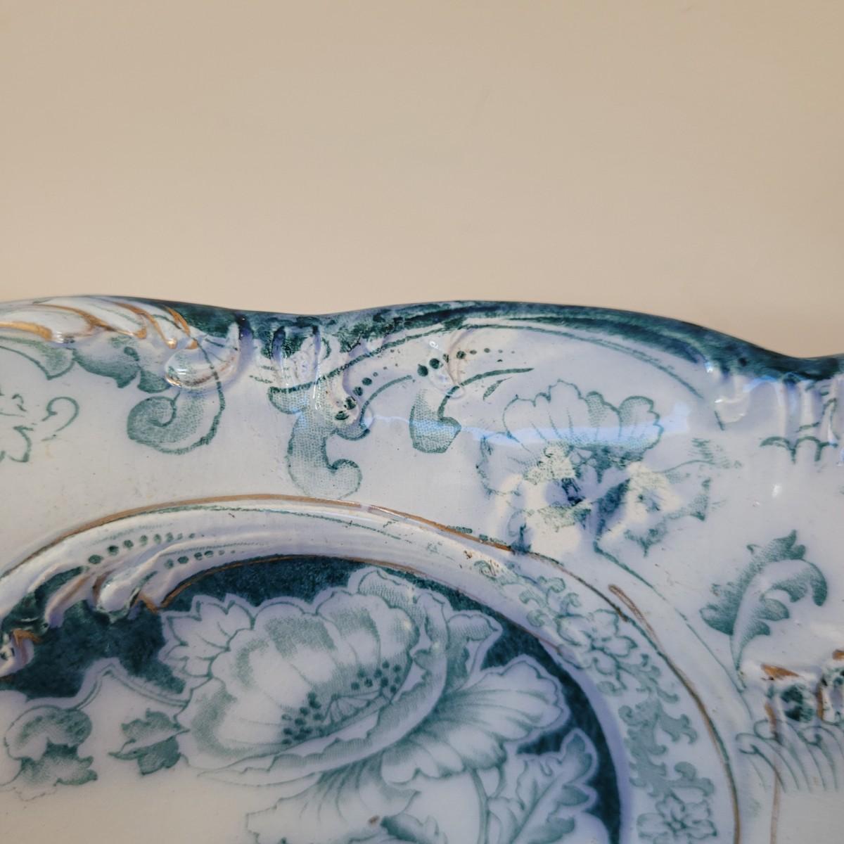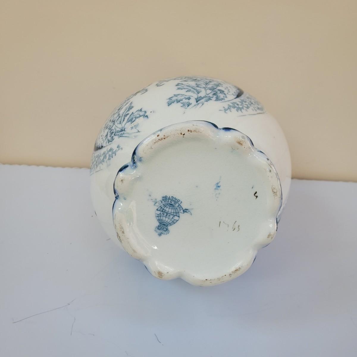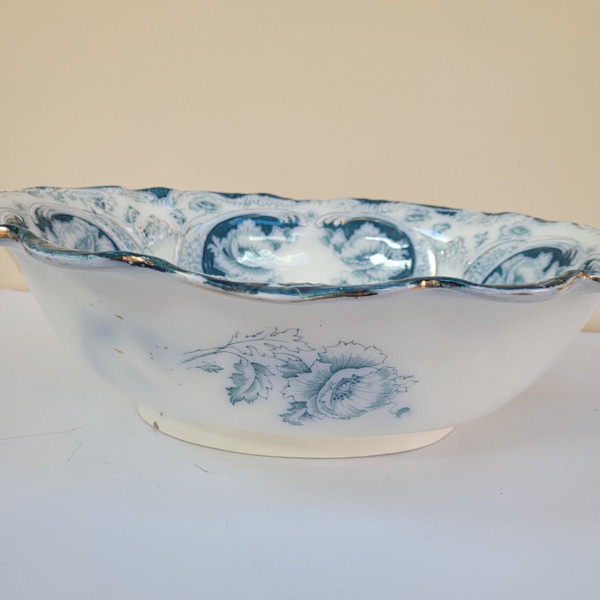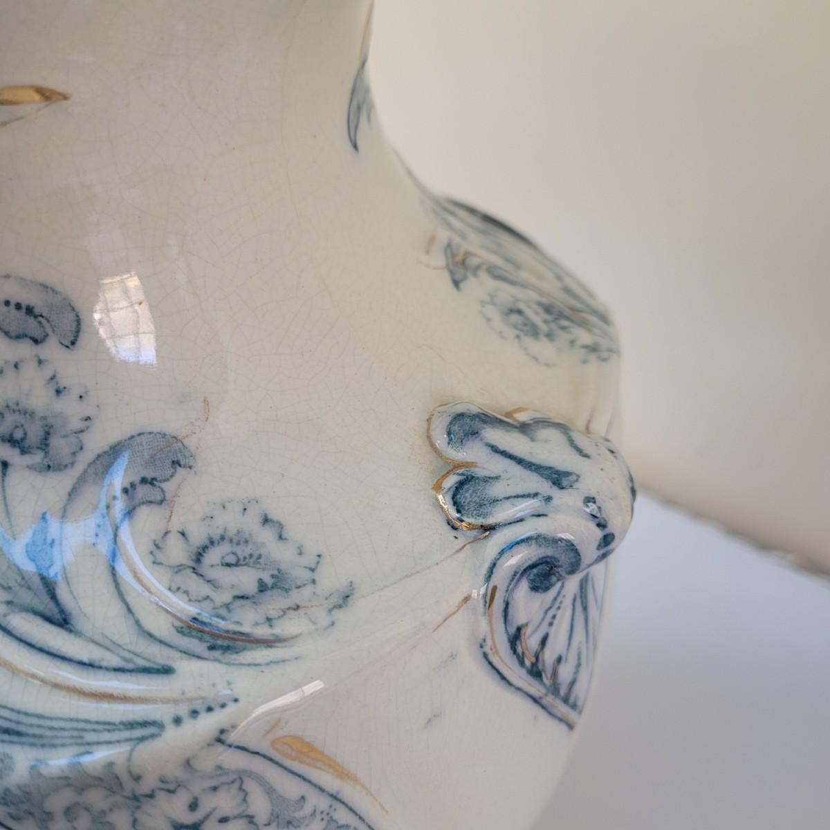 James Kent Old Foley Longton blue floral large pitcher and bowl. Raised floral relief with gold colored painted accent throughout. Chipping in ceramic and paint in some areas (see photos). Pitcher measures approximately 10"d x 13". Shipping available.