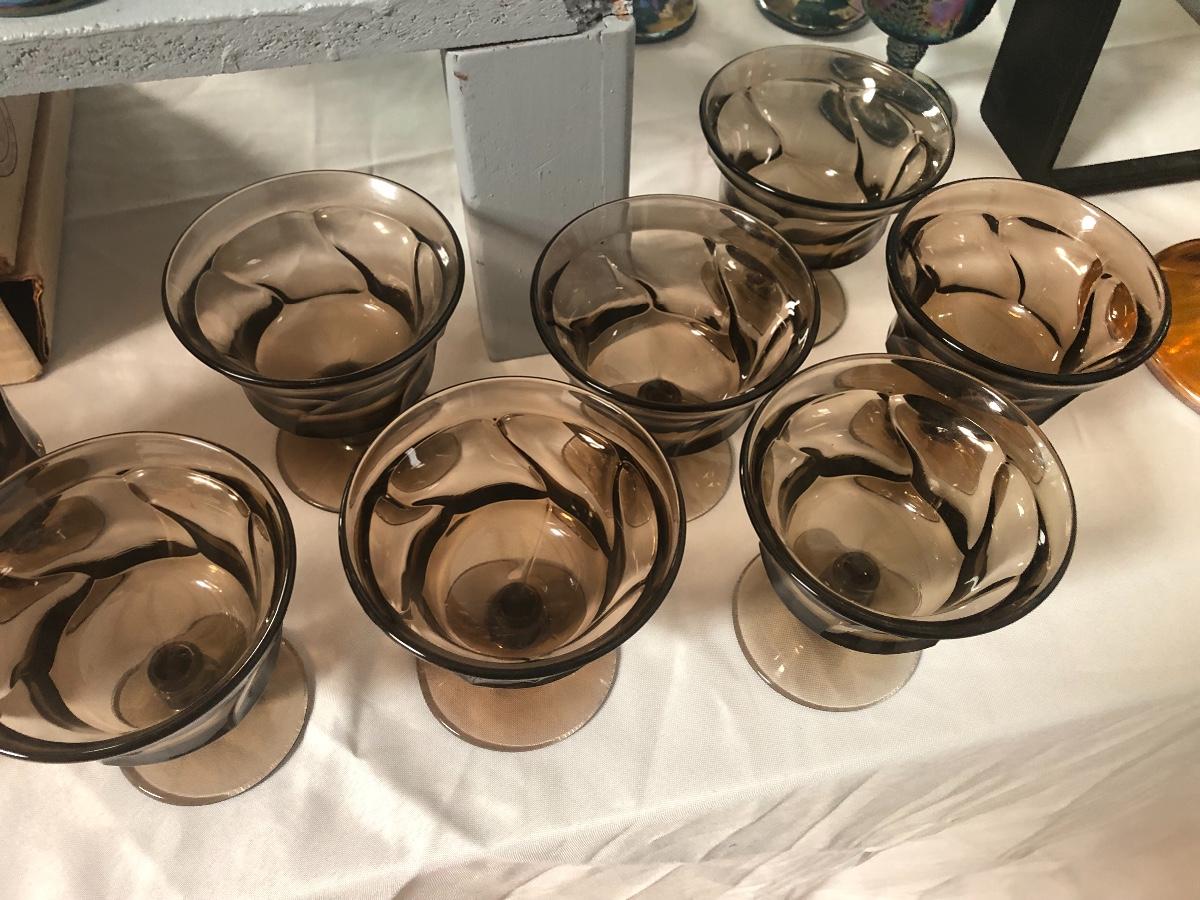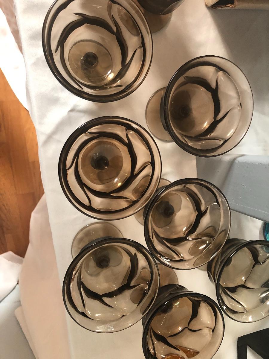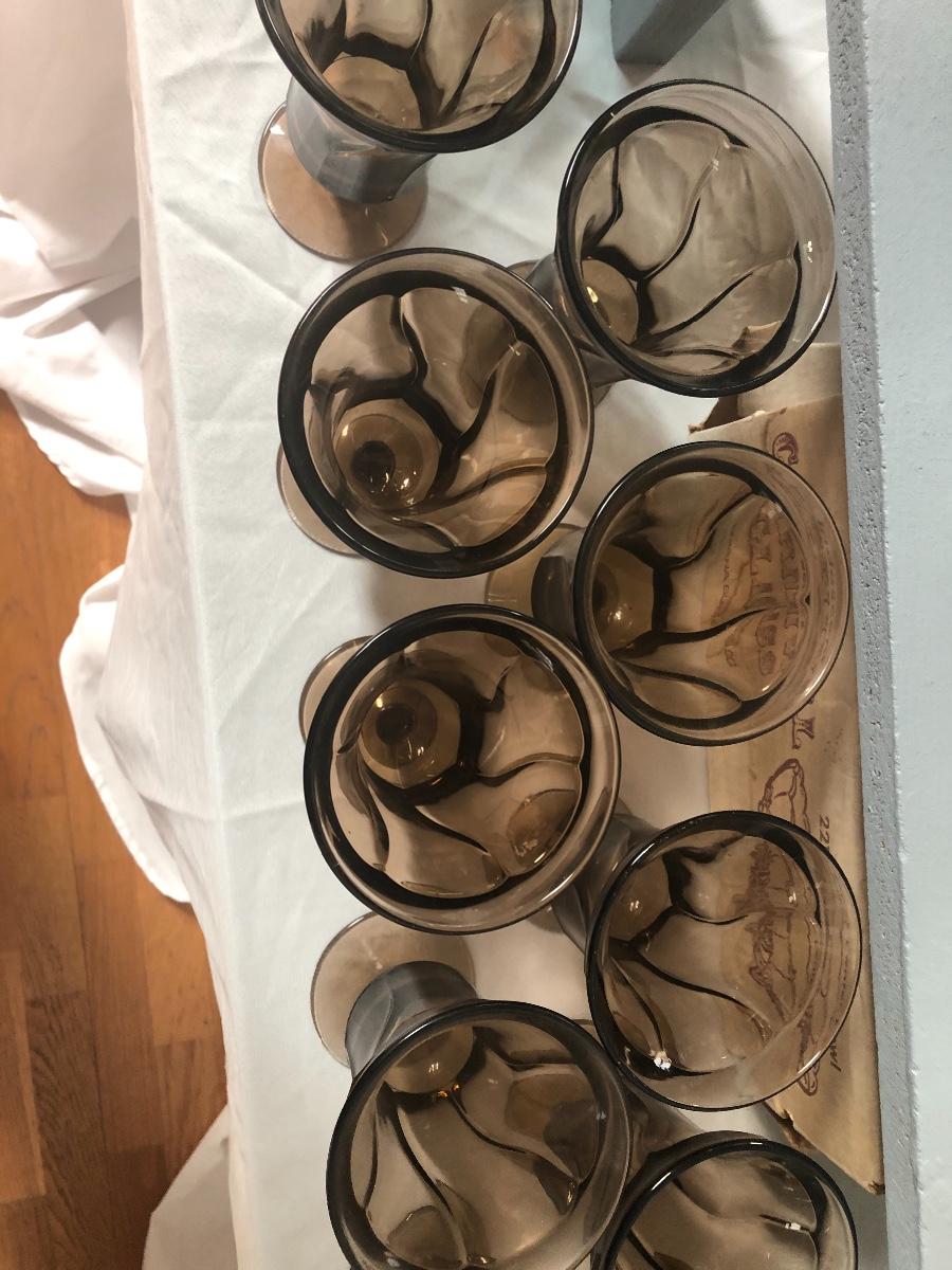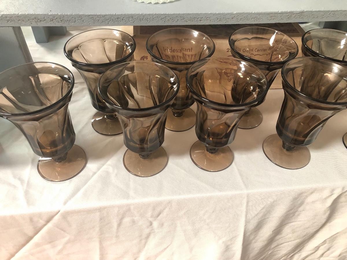 15 pieces of vintage distorts Jamestown brown. 8 tall juice glasses-6” high and 7 sherbet cups-4”