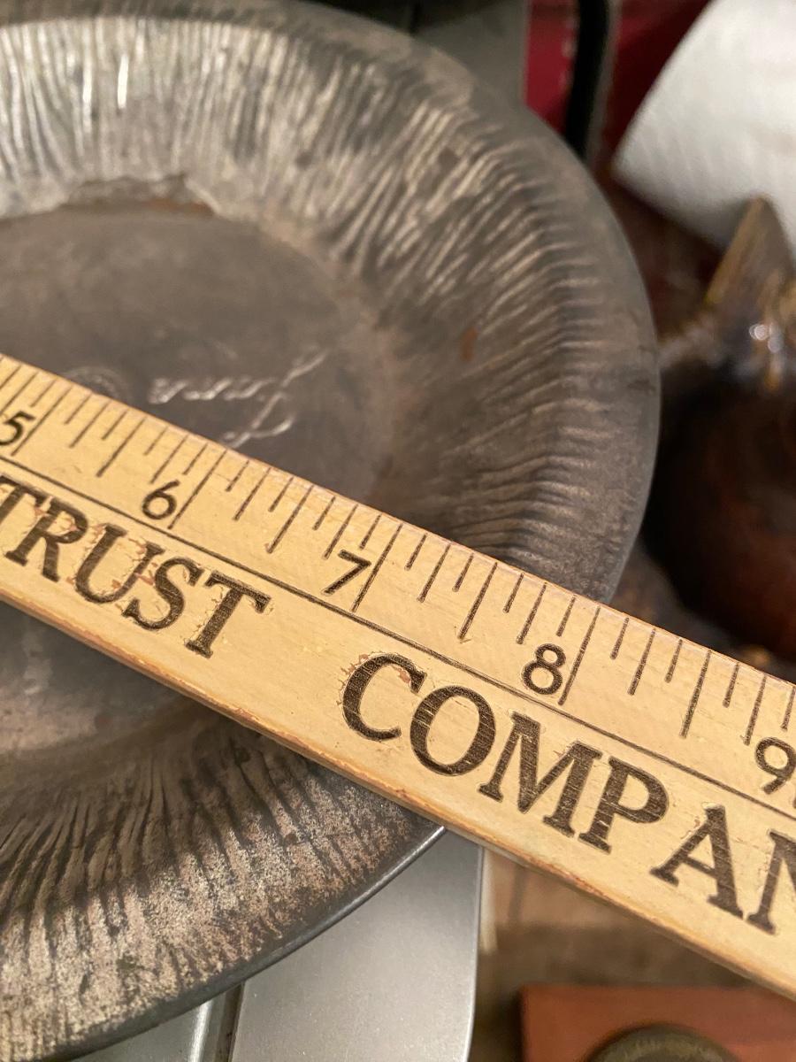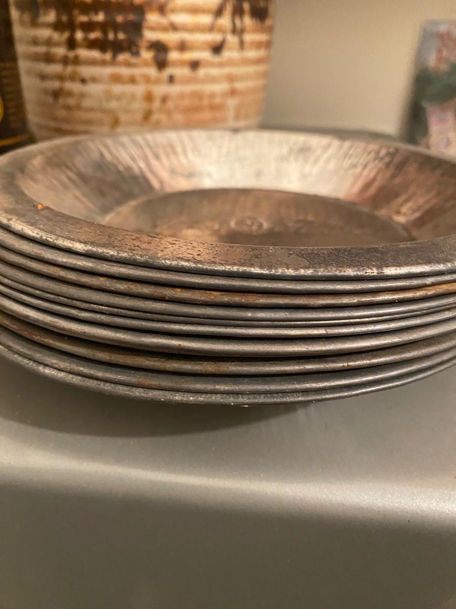 8" Overall width, 7" baking area x 1" deep. Some in better shape than others, but might clean up nicely, or display as is