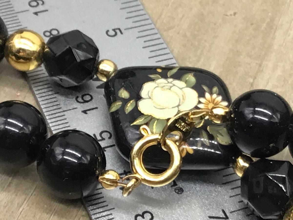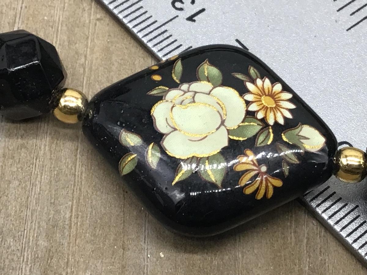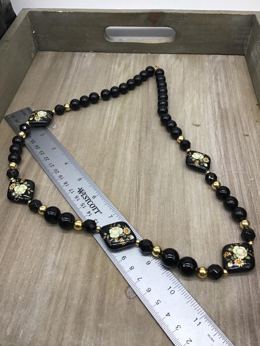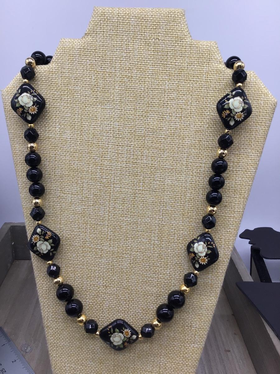 Vintage Japan Black Floral Double Side Necklace Gold Accent