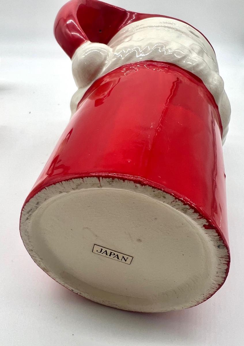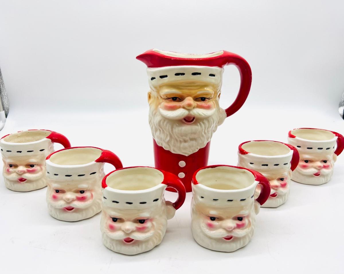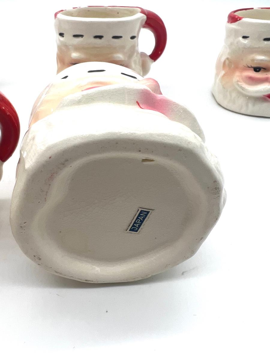Vintage JAPAN Christmas Set. 6 cups and one pitcher. No chips or cracks, some crazing inside mug. Santa pitcher measures 7 1/2 inches tall. Mugs measure 3 inches tall.
