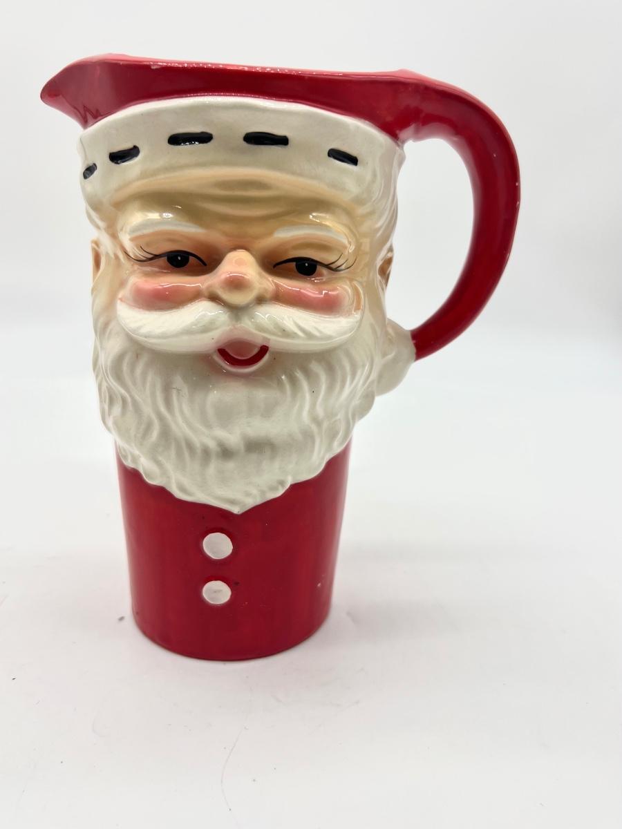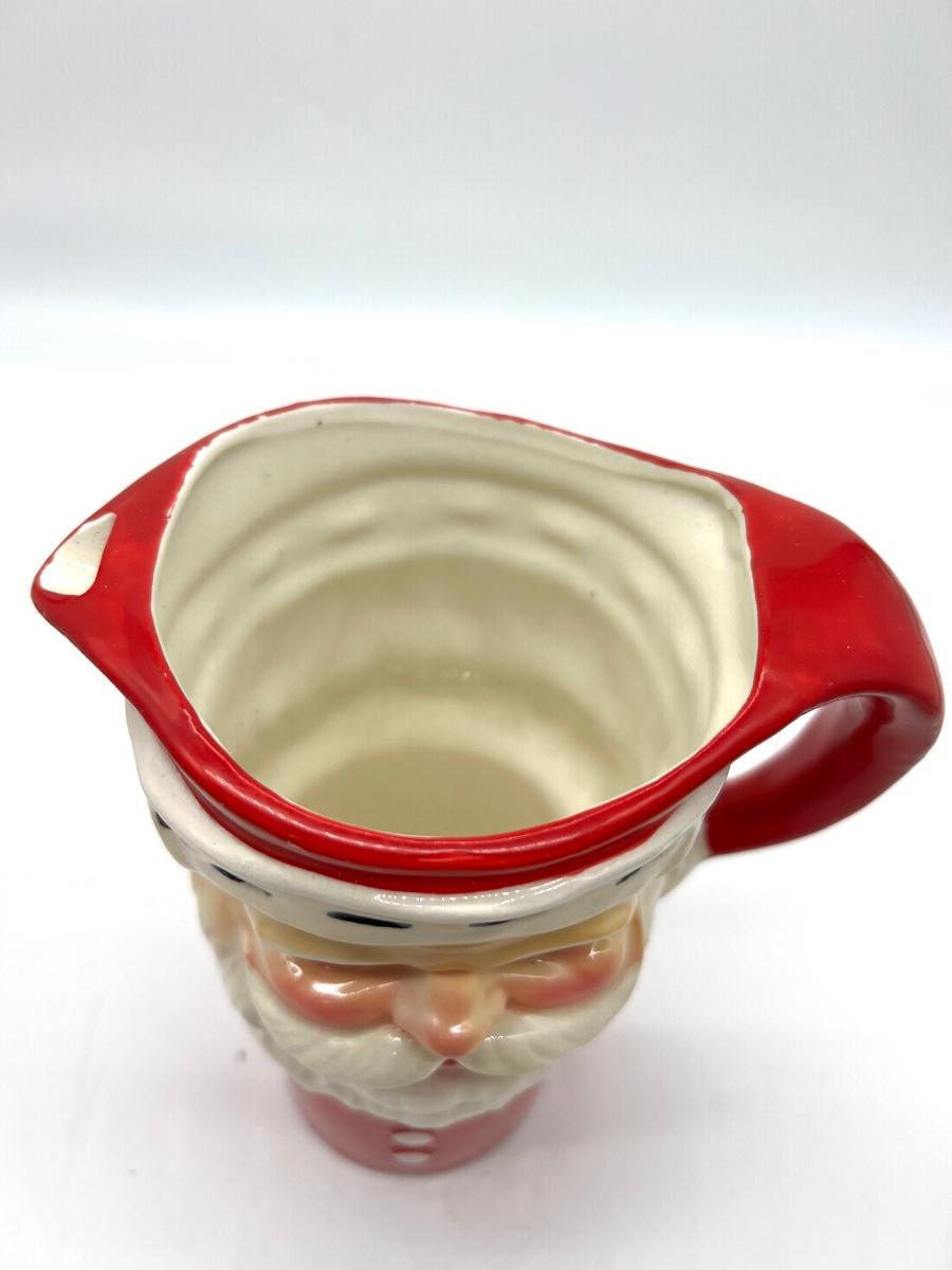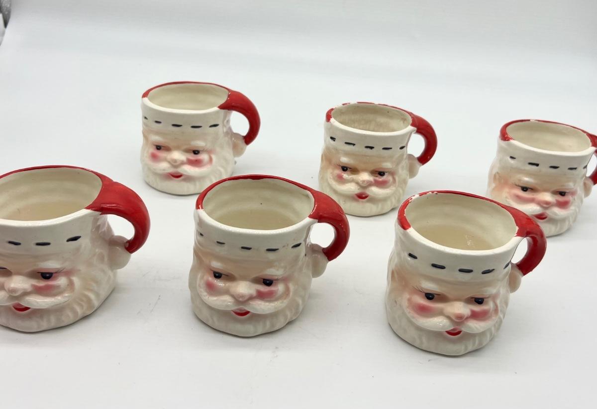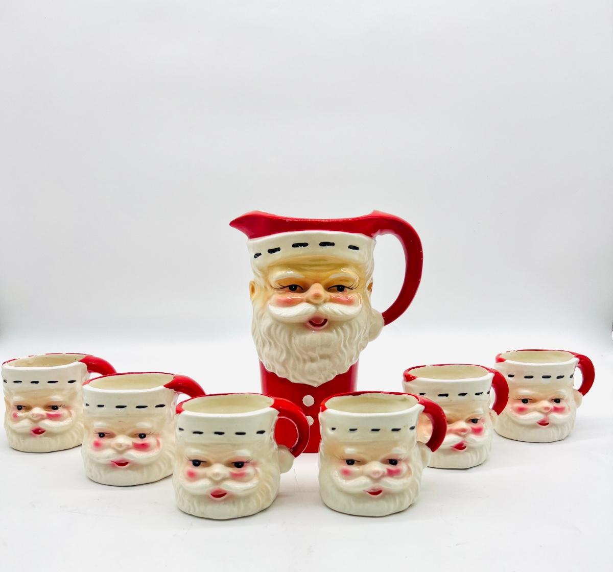 Vintage JAPAN Christmas Set. 6 cups and one pitcher. No chips or cracks, some crazing inside mug. Santa pitcher measures 7 1/2 inches tall. Mugs measure 3 inches tall.