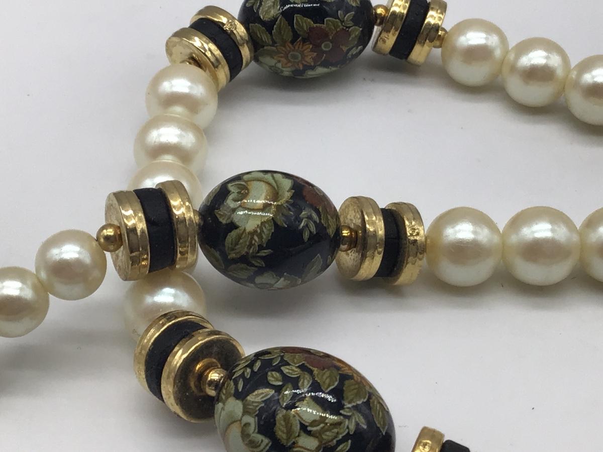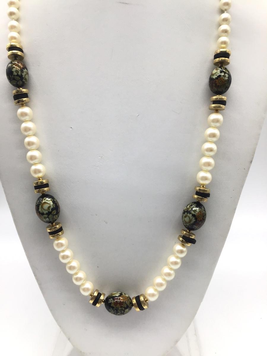 Vintage Japan Cloisonne Enamel Bead Faux Pearl Strand Goldtone Necklace Japan