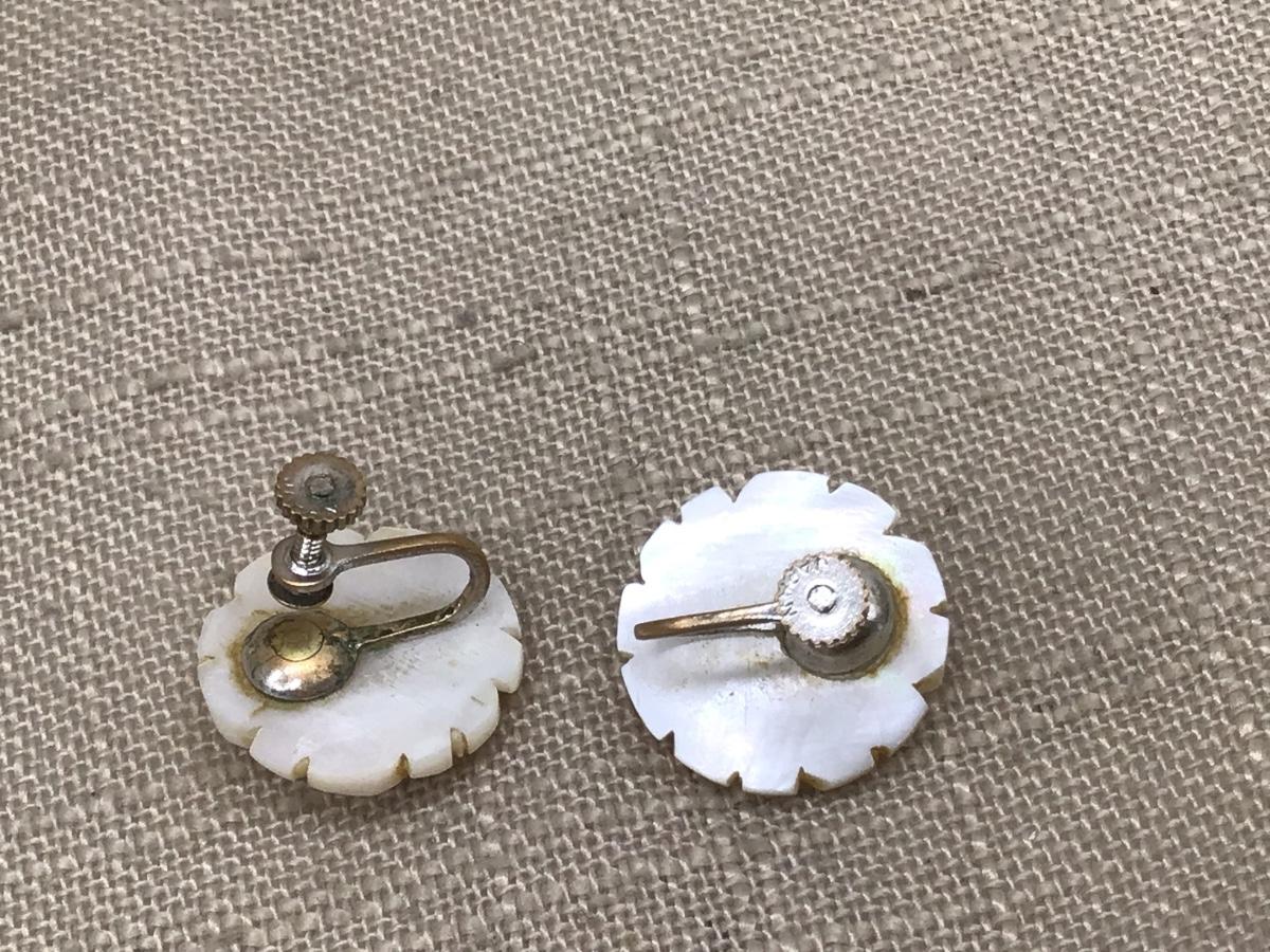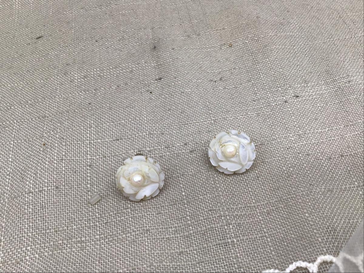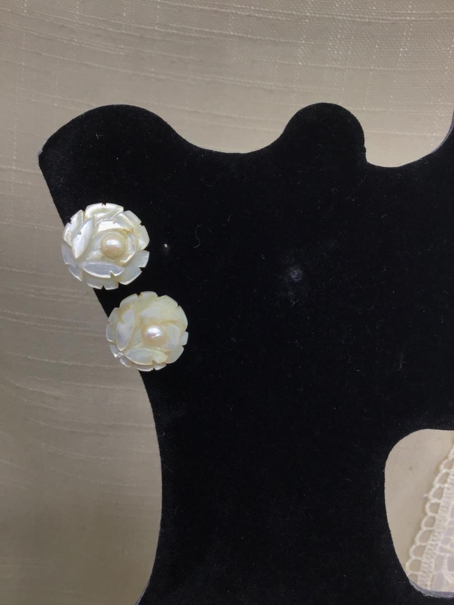 Vintage Japan, pearl with mother of pearl, Carved Rose Earrings