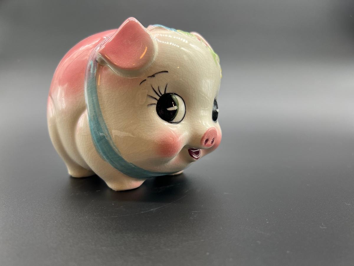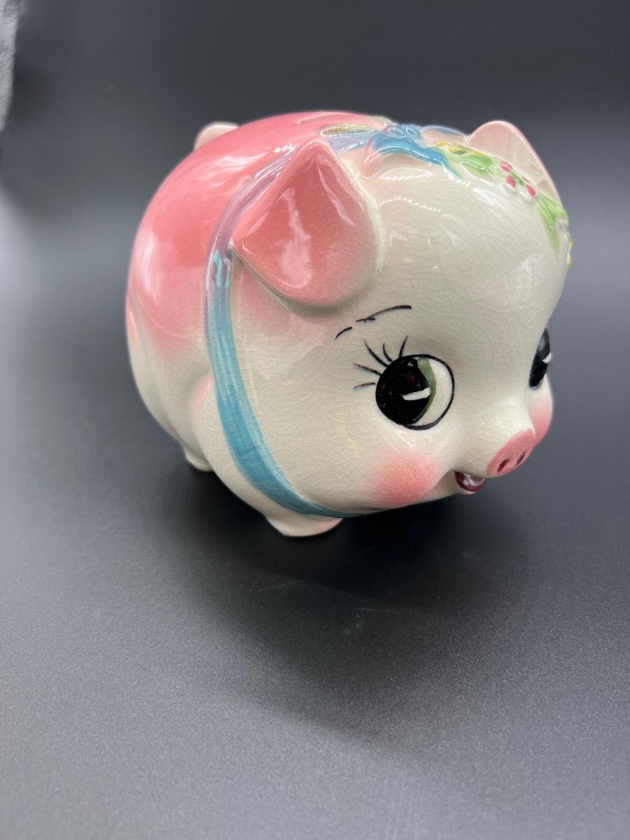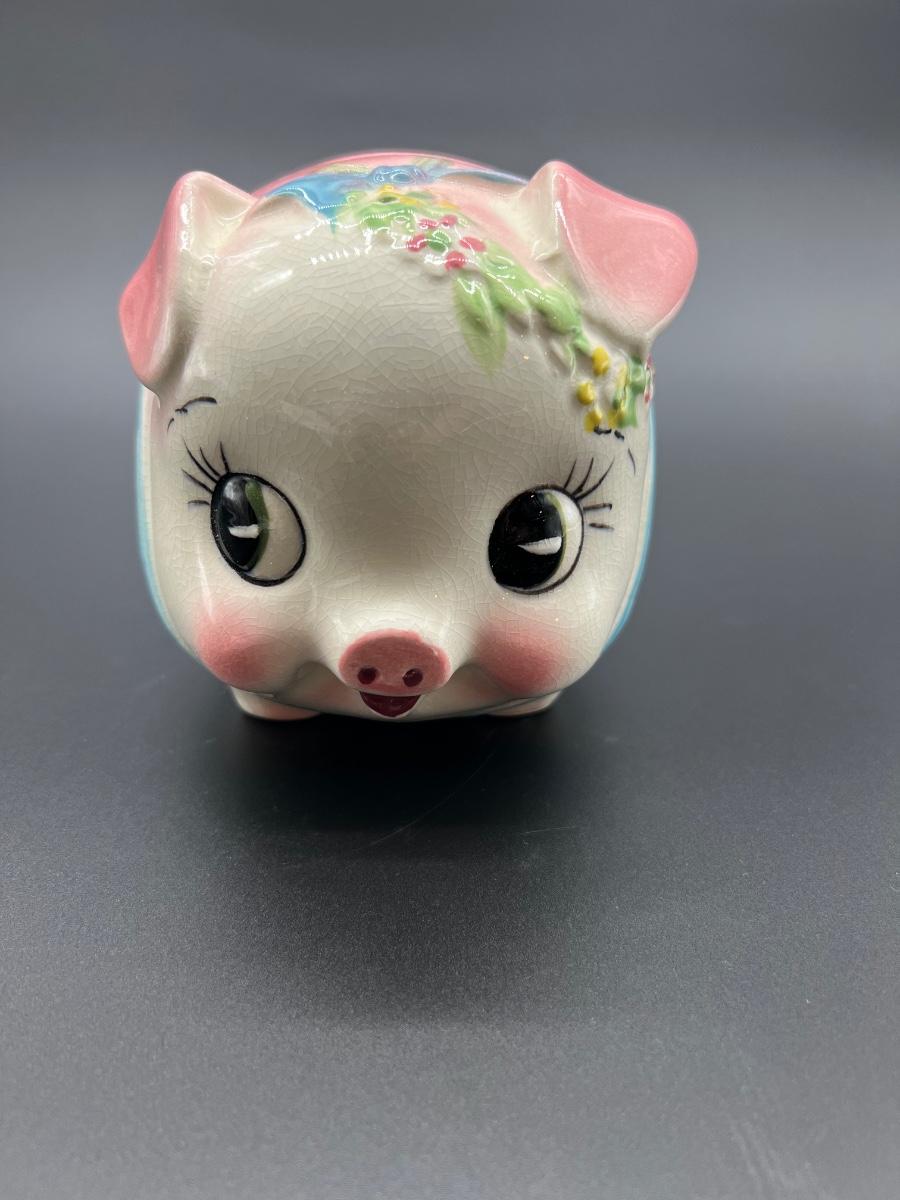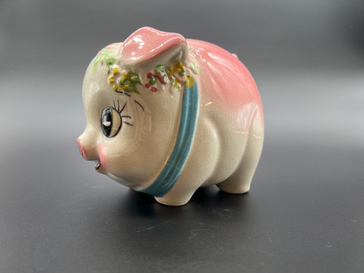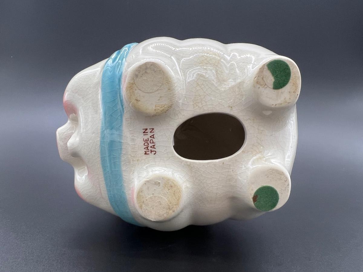 Vintage Japan Piggy bank with no stopper measures 5 inches tall, 5 inches wide, and 7 inches deep.