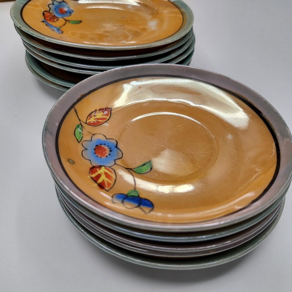 Child size, vintage, bone china play tea set includes (6) 4.5" plates, (5) 3.75" saucers, (5) 3" x 1" tea cups, 4.5" x 2.75" lidded tea pot, 3" x 2" sugar and 2.25" x 1.25" creamer. Orange lusterware and floral pattern. Made in Japan.