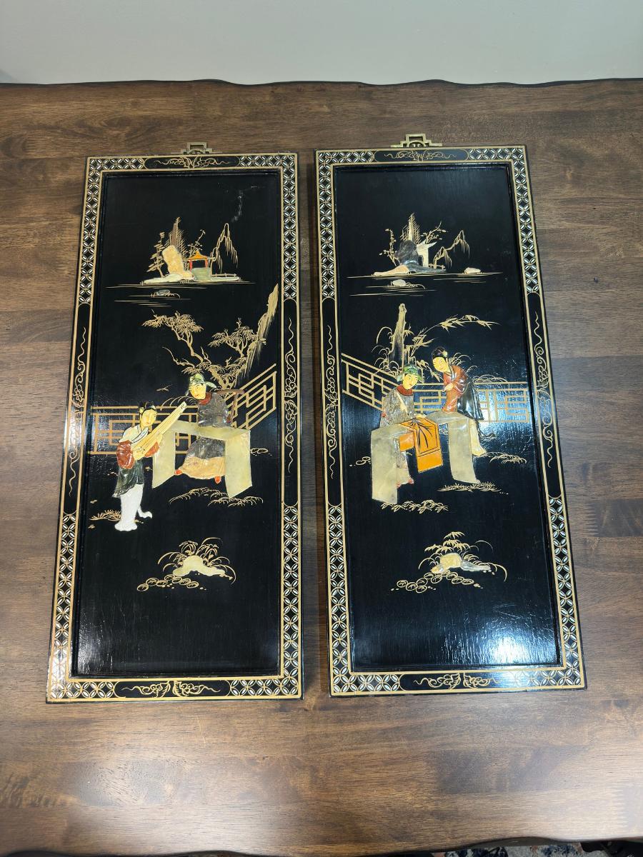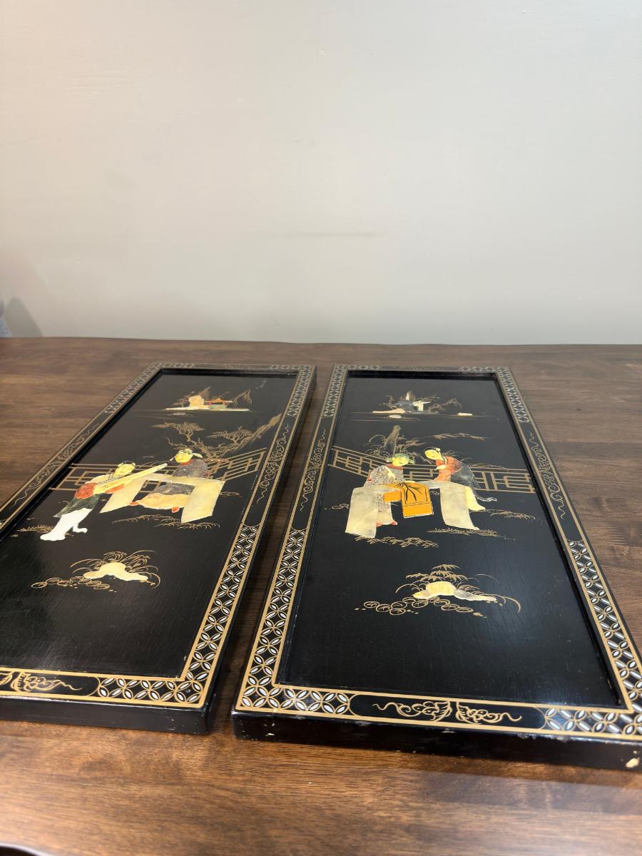 1. Vintage Japanese Black Lacquer and Stone Wood Panel Decor-Measurements: 24 x 10 x 1 inches