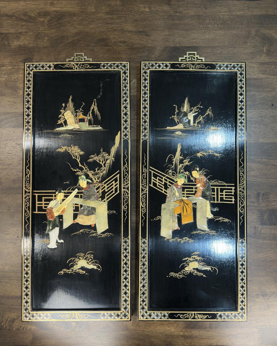 Vintage Japanese Black Lacquer And Stone Wood Panel Decor